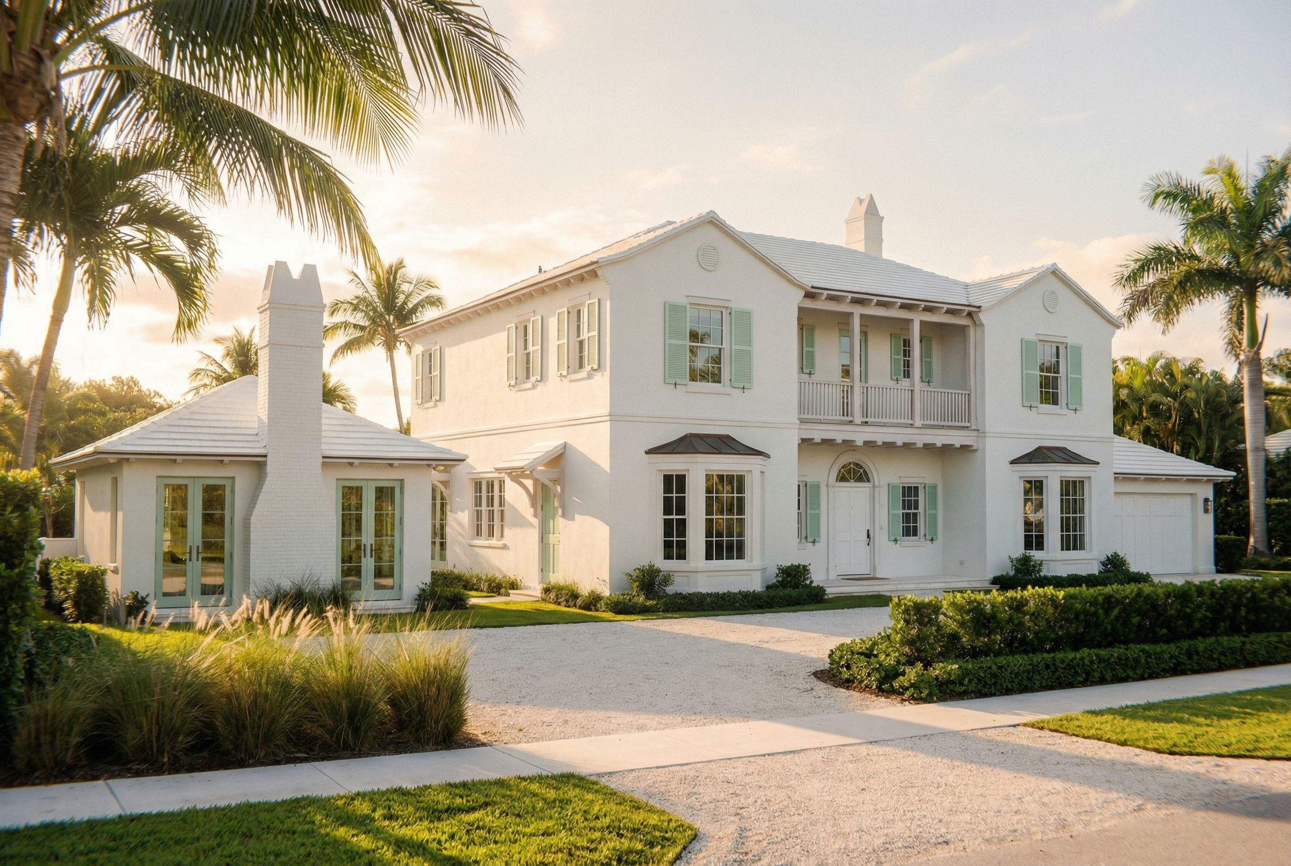Ultra-photorealistic architectural exterior rendering created from the provided elevation drawing. The render must follow the exact architectural proportions, heights, rooflines, window placement, and linework of the elevation. The elevation should be treated as the blueprint for the architecture. A reference image for massing may be used only to understand the overall composition, but the geometry must ultimately match the submitted elevation. Architecture style: refined Monterey Colonial style residence with elegant coastal character. Site composition: The scene includes a main house and a cabana. The cabana sits closer to the street, approximately 25 feet from the front property line. The main house is set farther back, approximately 30 feet from the front property line. The camera perspective should clearly show this depth relationship so the cabana reads slightly forward in the composition while the main house sits subtly behind it. Materials: Exterior walls: smooth white stucco with refined plaster texture Wood elements balcony, beams, brackets, posts, soffits: whitewashed pecky cypress with visible natural grain Roof: white concrete tile roof with realistic tile depth and soft matte finish Shutters and accent trim: Benjamin Moore Fresh Dew, a soft pale mint green Front door: painted white Garage door: painted white Architectural character: Classic Monterey style second floor balcony with wood posts and railing Restrained colonial proportions Elegant and simple coastal architecture Lighting: Cinematic golden hour lighting with warm sunlight and soft long shadows Dreamy atmospheric glow with subtle coastal haze Soft sky tones creating a luxurious architectural “money shot” mood Environment: Palm Beach coastal landscaping with palms, ornamental grasses, and manicured hedges Light shell stone or limestone driveway and walkway Soft tropical sky with warm sunset tones Camera and composition: Cinematic perspective “money shot” view Slightly low camera angle to emphasize architecture 35mm architectural lens Three-quarter perspective that reveals depth between the cabana and the main house Balanced composition with the architecture as the focal point Rendering style: Ultra photorealistic architectural visualization Magazine-quality architectural photography Extremely detailed materials and realistic shadows Global illumination and high dynamic range lighting 8k detail Important constraints: Maintain the exact geometry from the provided elevation Do not change window spacing, roof shapes, or architectural proportions Do not modify the building massing Treat the elevation drawing as the strict blueprint for all architectural linework and proportions , keep exact camera angle