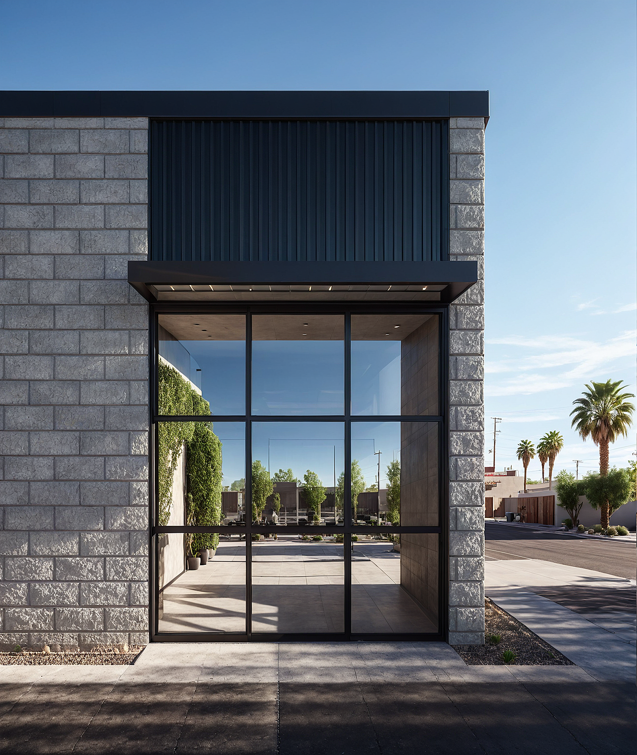 Architectural visualization of a hair salon's shopfront in Phoenix, Arizona, clear sunny sky mood, low planting shrubs, historic neighborhood, smooth concrete walkway.