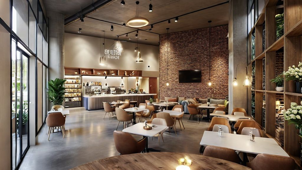 Photo of a modern café interior, featuring Indonesian style and warmambiance. living room style with big store front to let the sunlight beam into the space. Big wall feature with bookshelves, cofe mug, framed bean bag , tv with story of cofee farm and modern light pendant. Open ceiling concept exposed Ducting and pipes. Stain concrete floor with simering of light and reflections . Tables and chairs are modern style, with some book and flower planters