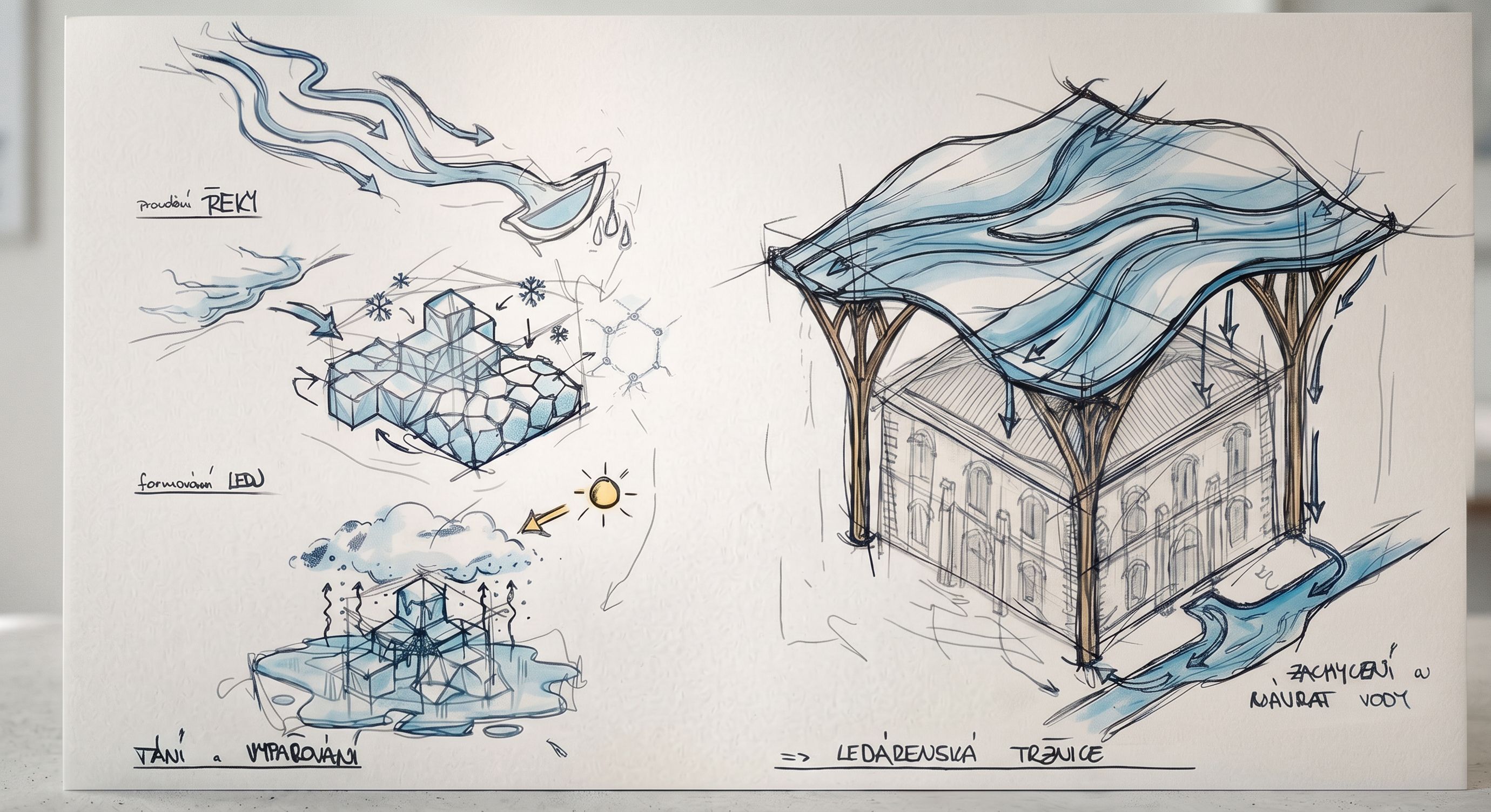 looks like an architecture student conceptual sketch, competition board quality, calm and refined.,hand-drawn architectural concept diagram on white background, minimal clean composition, black ink sketch with soft light blue watercolor accents, showing water flow transforming into architecture and back into river, sequence of diagrams arranged horizontally and vertically, including: river flow lines, organic roof structure supported by columns, structure extending and dissolving into river, circular water cycle river → ice → evaporation → return, and cyanotype process paper → water → sun → blue print, simple readable layout, thin lines, no shading clutter, soft artistic style, conceptual architecture sketch, clear arrows and minimal handwritten labels, calm and poetic atmosphere, lots of white space, keep exact camera angle