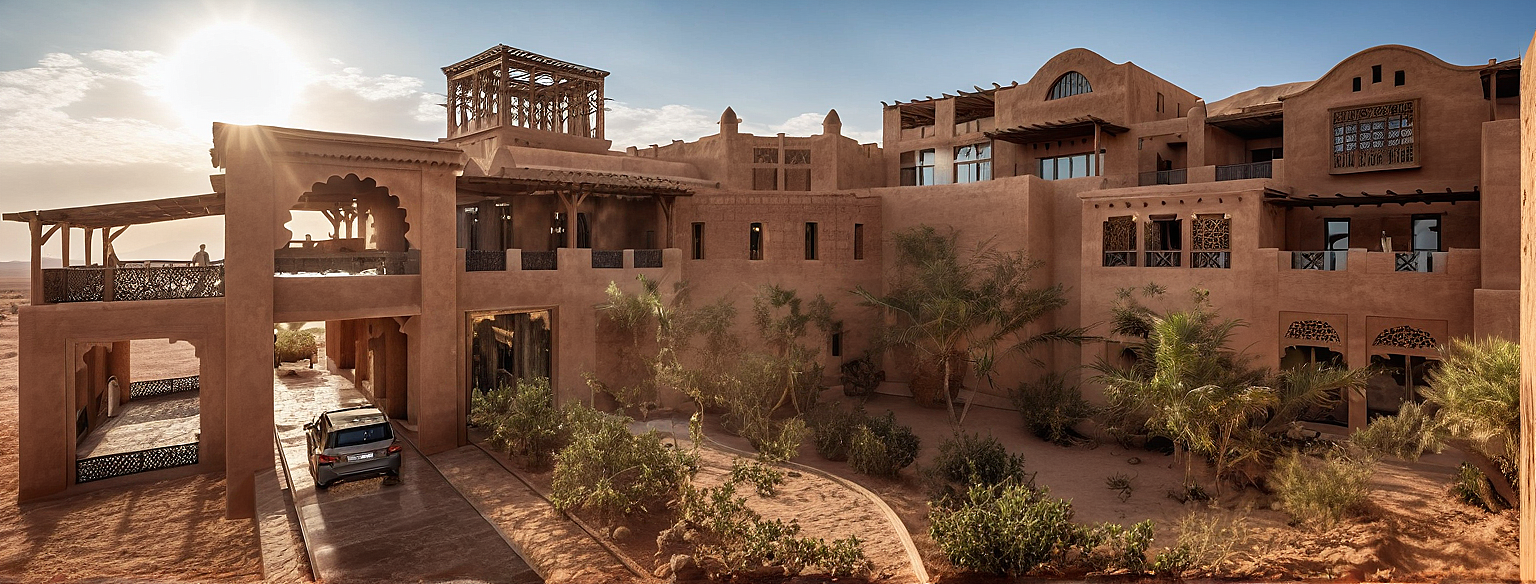 Prompta boutique mud hotel in the desert with mud wall facade and arabian finishes and has the mashrabiya window limit glass windows. make the sky during the morning with sun shining and clouds and blue sky