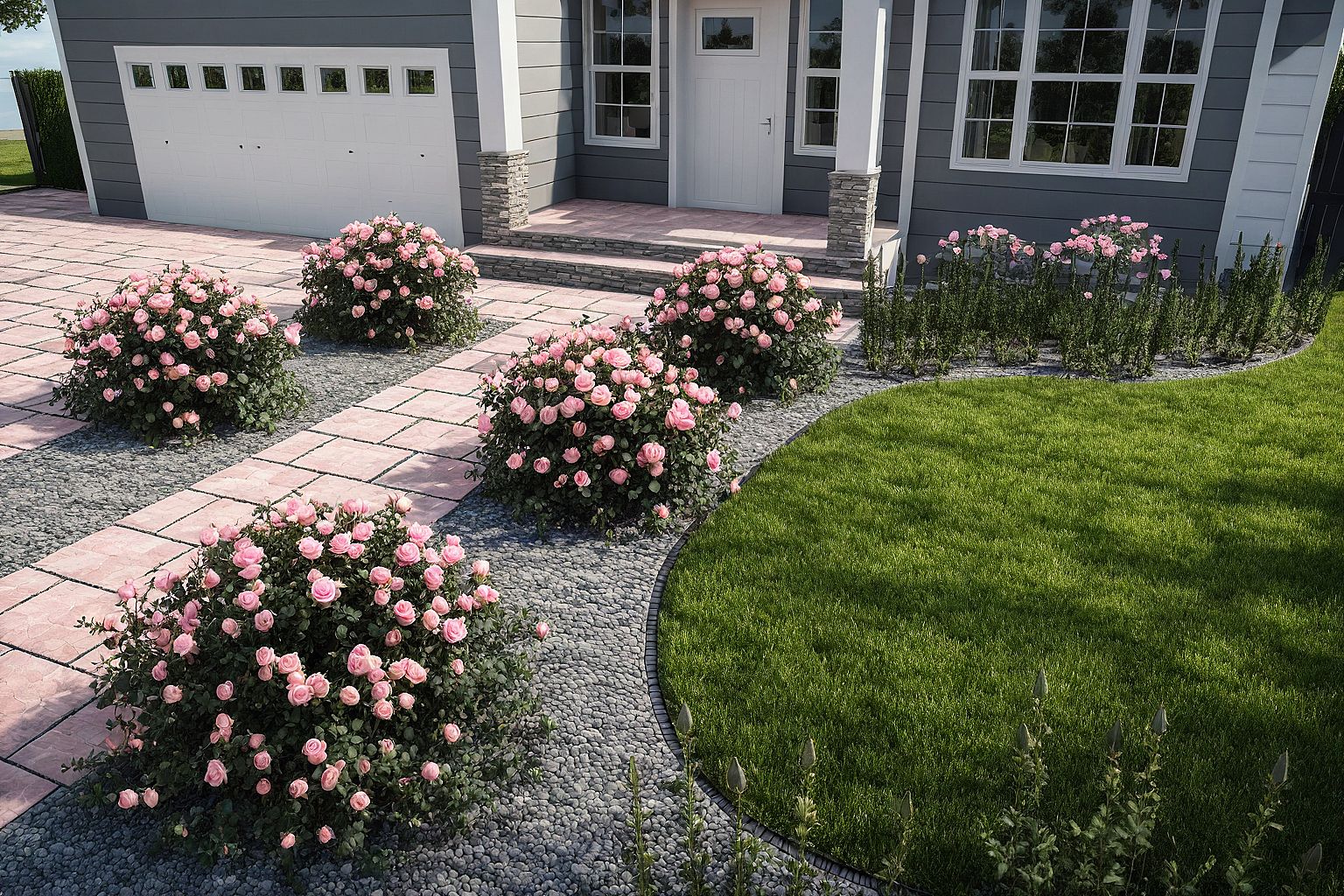 Promptmake this photo realistic, pink roses, pavers, lawn, gray stone bedding