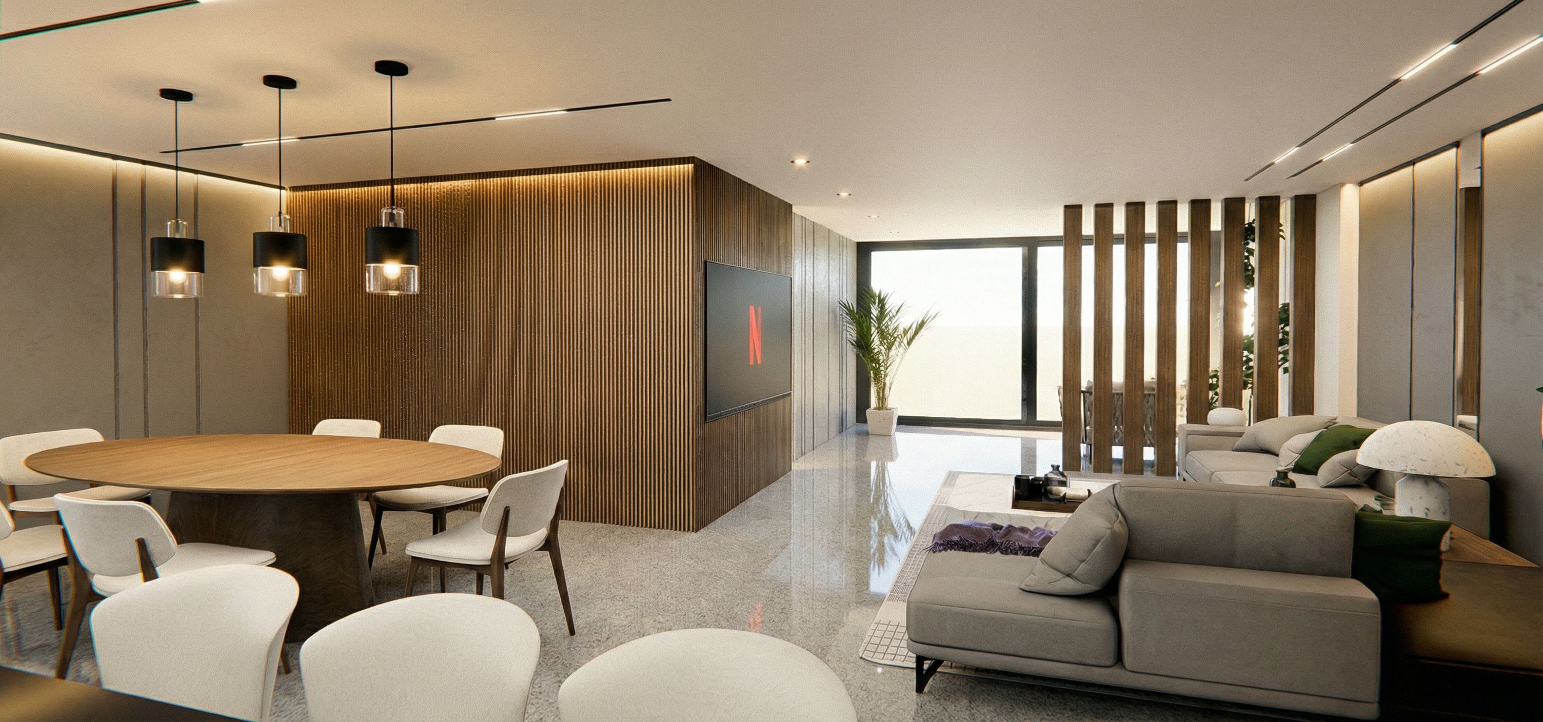 Promptpuedes ayudarme a cambiar el piso por granito color gris claro se debe ver el brillo, y las lamparas colgantes son como las que te adjunto en referencia , keep exact camera angle
