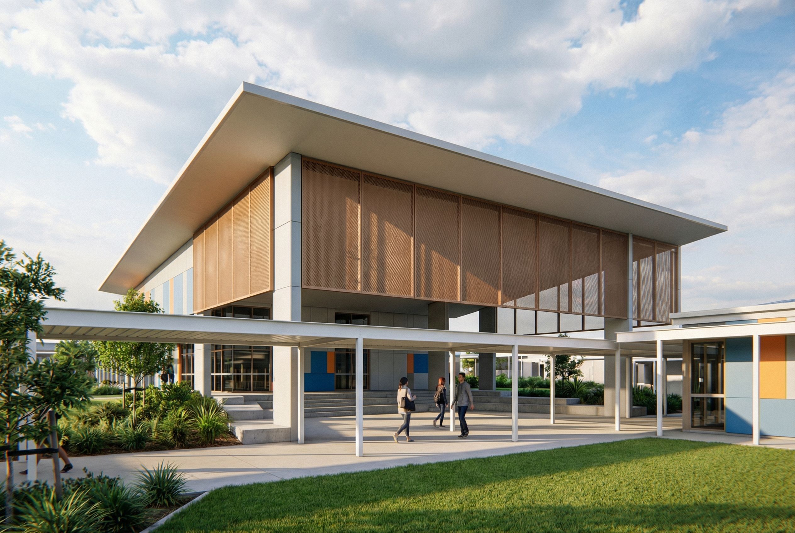 PromptPhoto of a modern architectural structure featuring clean lines and minimalist design. The building showcases expansive perforated metal panels and a striking flat roof, accentuated by metallic supports. Set in a serene urban environment with low-lying elements around it, the setting evokes tranquility. Bright, natural daylight illuminates the scene, casting soft shadows that enhance the depth. Captured from a low angle perspective emphasizing the height and grandeur of the design, with a wide lens to encompass the surroundings., keep exact camera angle