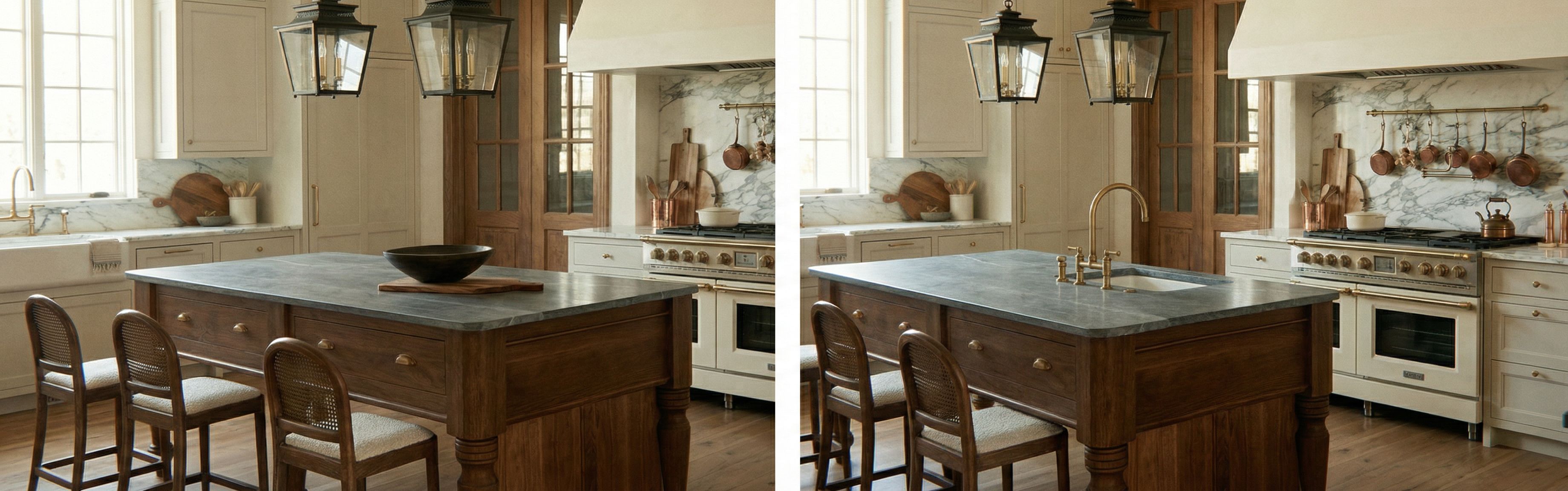 Promptchange range to the reference photo, Make the kitchen island have grey soapstone countertops.make the kitchen island like the reference photo but add grey soap stone countertop. add a sink onbthe island across from the range. add a brass faucet. add vintage iron bar stools to the island. , keep exact camera angle