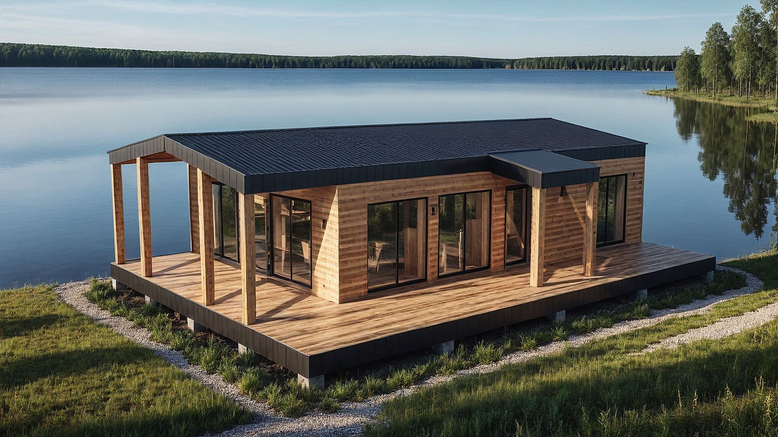 PromptA modern barnhouse with wooden planks. A forest and a lake in background.