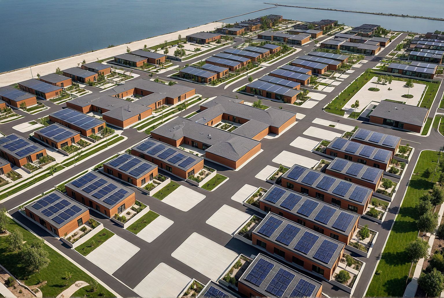 Photo of a modern residential neighborhood, featuring low-rise buildings with flat roofs and solar panels. Emphasize the sleek, rectangular forms, large glass windows, and the minimalist design. The urban setting includes spacious streets and a nearby playground surrounded by green areas. Bright daylight enhances the scene, casting soft shadows that define the architectural elements. Aerial perspective using a wide-angle lens captures the layout and symmetry of the neighborhood, highlighting connectivity and open spaces for community engagement.