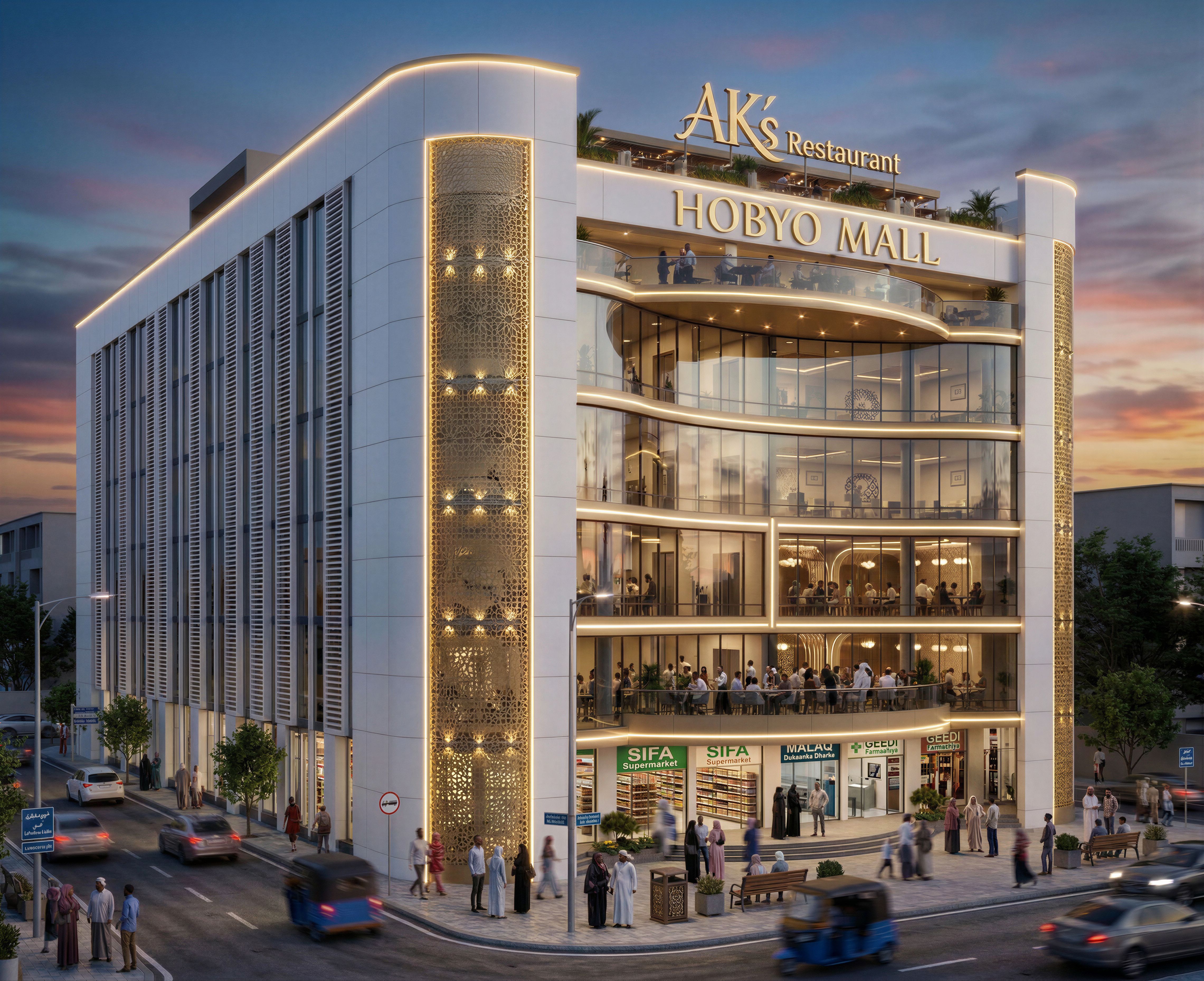 EnhancedPromptCommercial mall in Mogadishu Somalia. Make the glass realistic and reflective. Ground floor Supermarket and shops. First floor Restaurant with a balcony overlooking the road. Use white aluminium composite panels on the building . PUT PEOPLE OF SOMALI ORIGIN ON THE STREET. INCLUDE SOME SPOT LIGHTS, ROPE LIGHT AND STREET LIGHTS ON THE BUILDING. MAKE IMAGE HIGH RESOLUTION 8K. PUT NAME "HOBYO MALL" ON THE TOP PART OF THE BUILDING. PUT THE NAME "AKs Restaurant " on the roof top restaurant facing the road. MAINTAIN THE NUMBER OF LEVELS IN THE ORIGINAL DESIGN. KEEP THE ORIGINAL DESIGN. RESTAURANT IS ONLY ON FIRST FLOOR AND ROOF TOP. Use the reference file for the design but make the image high resolution of 8k., keep exact camera angle, keep exact camera angle
