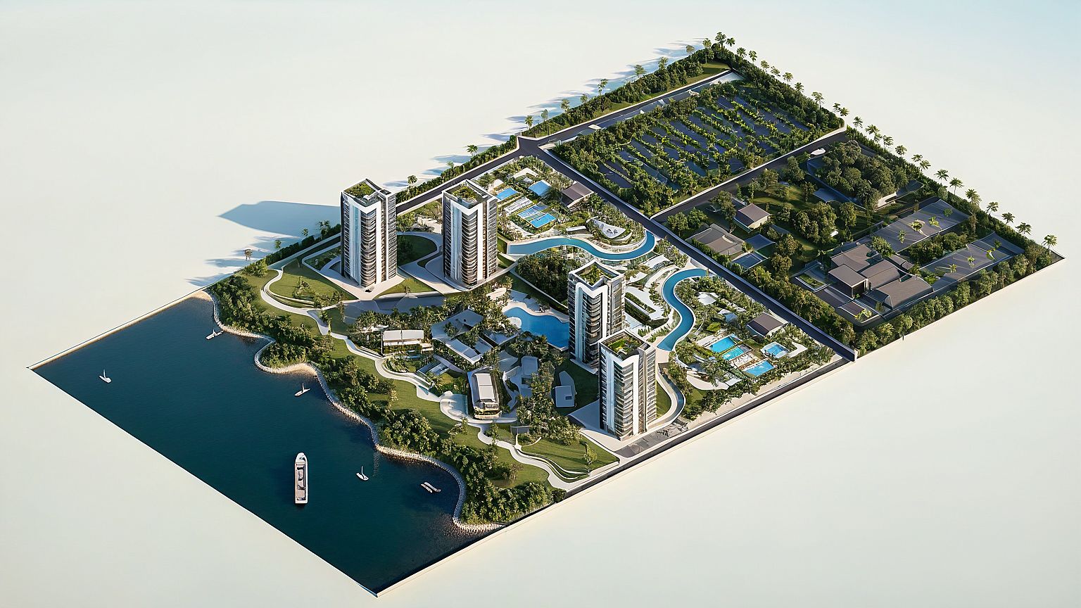PromptPhoto of a modern residential complex featuring high-rise towers clustered near a serene waterfront. Highlight architectural elements such as sleek glass facades, textured concrete, and landscaped terraces with lush greenery. Set against a vibrant urban backdrop, incorporate nearby amenities like swimming pools and recreational areas. Capture golden hour lighting, casting soft shadows and highlights on the buildings. Use a wide-angle perspective from above to emphasize the layout and spatial relationships, showcasing the interplay between natural and built environments.