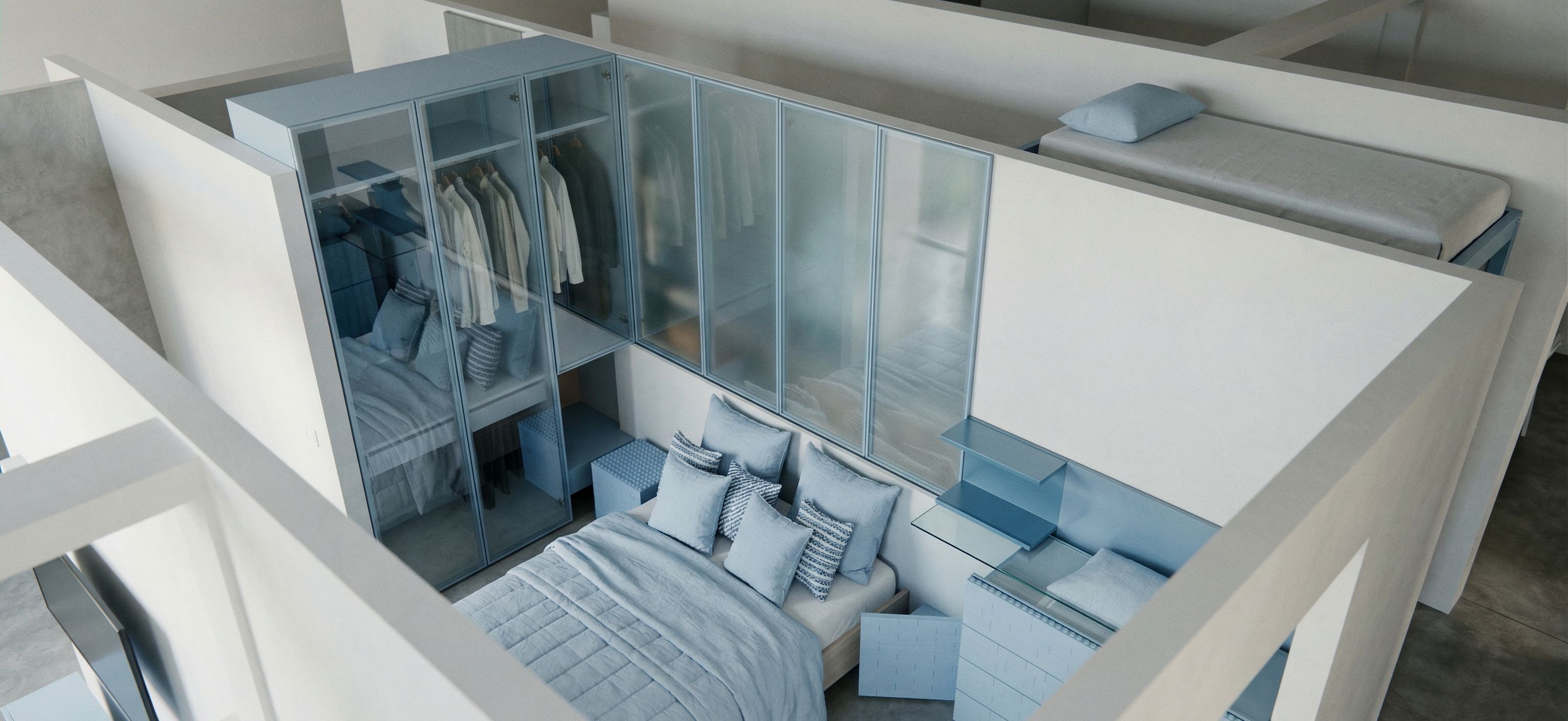 PromptCreate a high-quality realistic interior render of a modern room. Replace all beige elements with a soft light blue color (#C3D5E1) from the reference palette. The overall style should be clean, minimal, and contemporary. The wardrobe must be entirely made of glass, with transparent or slightly frosted panels, including realistic reflections and light behavior. The LEGO desk should adopt the same light blue color (#C3D5E1), maintaining its modular LEGO texture but with a refined and cohesive design. The chest of drawers positioned under the wardrobe must feature a top-opening system and a glass top surface, with realistic materials and reflections. Use soft natural lighting, balanced exposure, and realistic shadows. Emphasize materials such as glass, reflections, and subtle textures. The final render should be photorealistic, clean, and modern., keep exact camera angle