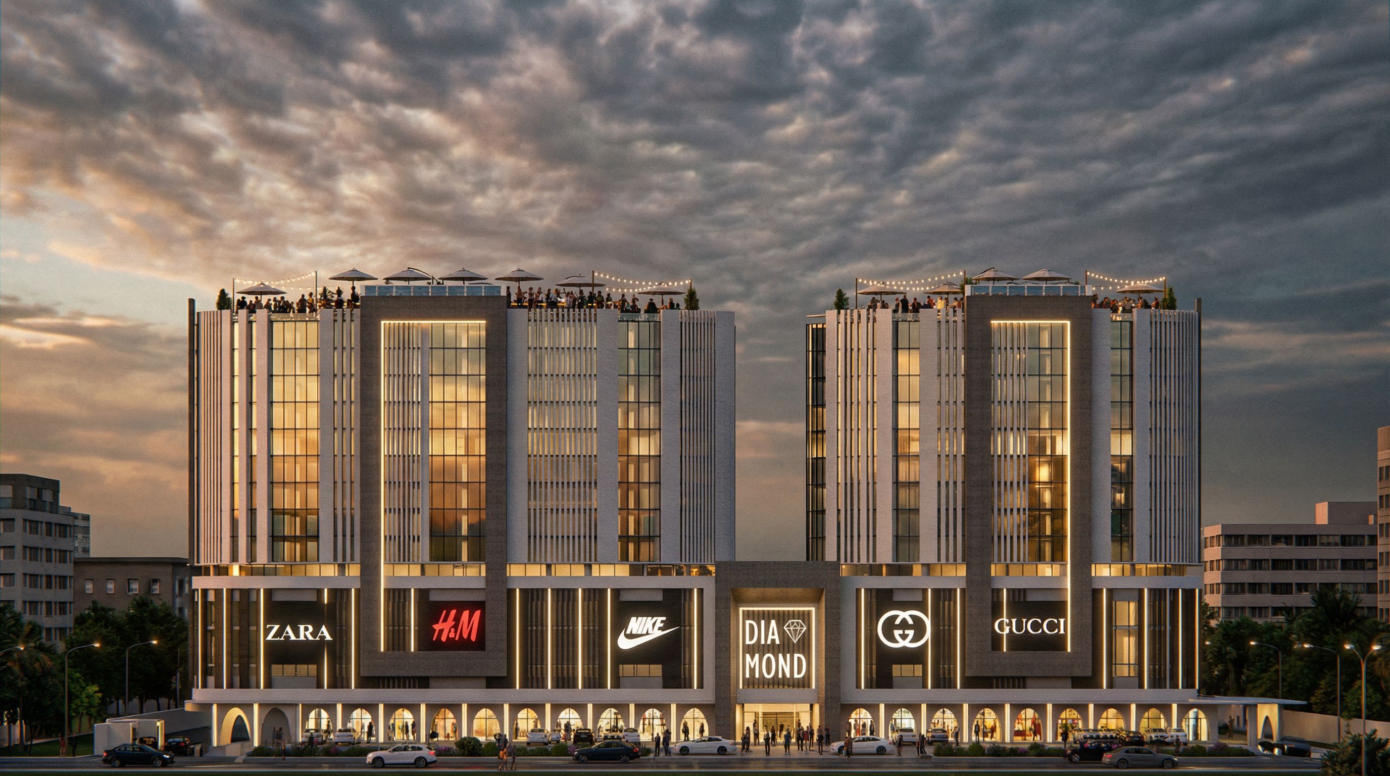 Photo of a modern commercial building featuring sleek glass and concrete façades, emphasizing vertical lines and a striking entrance with illuminated signage. Surrounded by a bustling urban landscape, with adjacent structures enhancing the city vibe. Captured during twilight, showcasing dramatic cloud formations and reflections on glass surfaces. Shot from a straight-on perspective with a wide-angle lens to enhance scale and depth, highlighting architectural details and textures within the composition. and the podium is a commercial center mall add to the elevation the some large logos of clothes brands with light behind add linear lights and add people enjoying shopping at the entrance and there are restaurants on the rooftops but without changing the architecture ;and make it super realistic and add lights inside as there are people living in the apartments, keep exact camera angle, keep exact camera angle