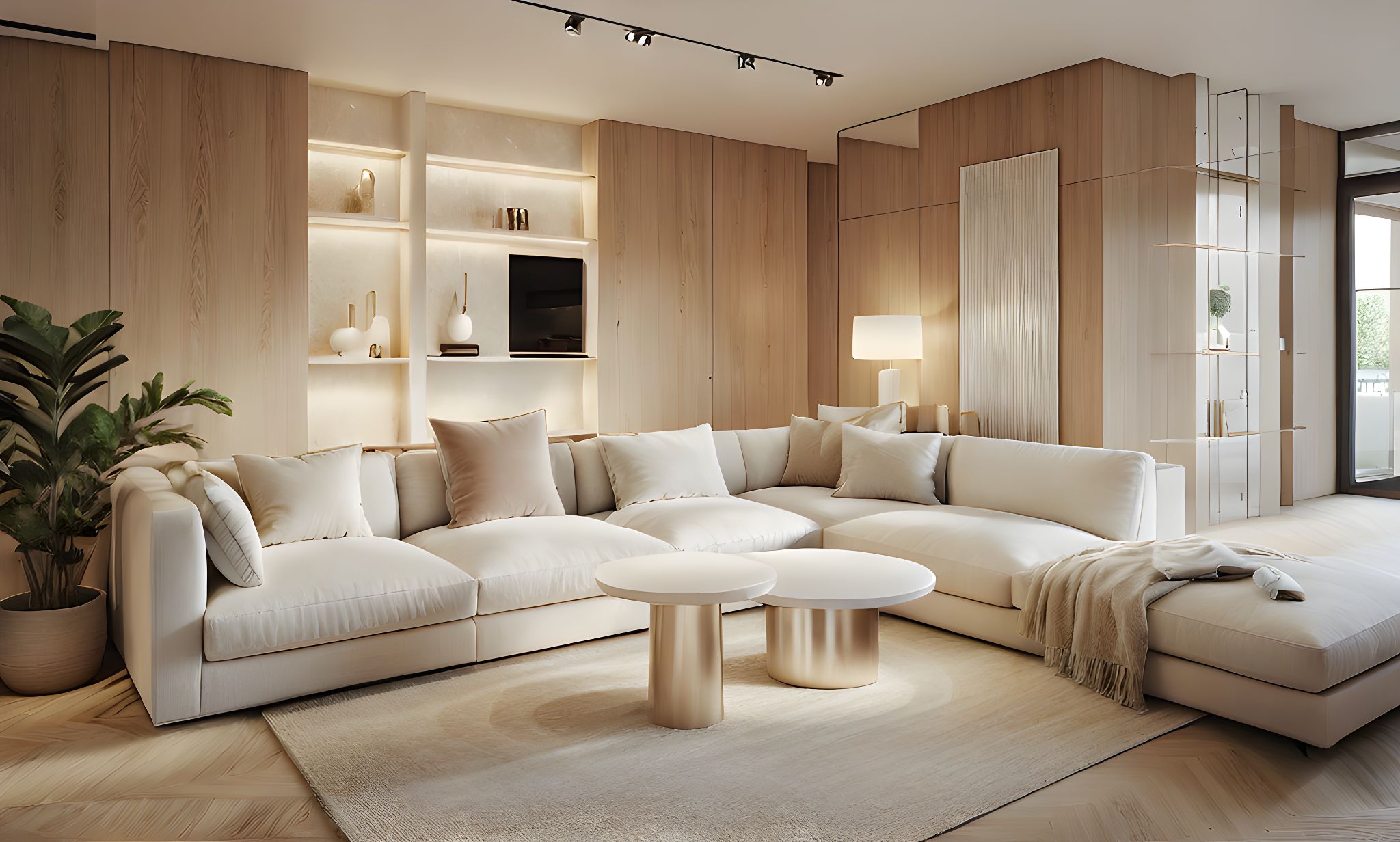Promptcosy luminous living room, white piano on the left to white coffee tables and light beige rug and light oak wood on the walls