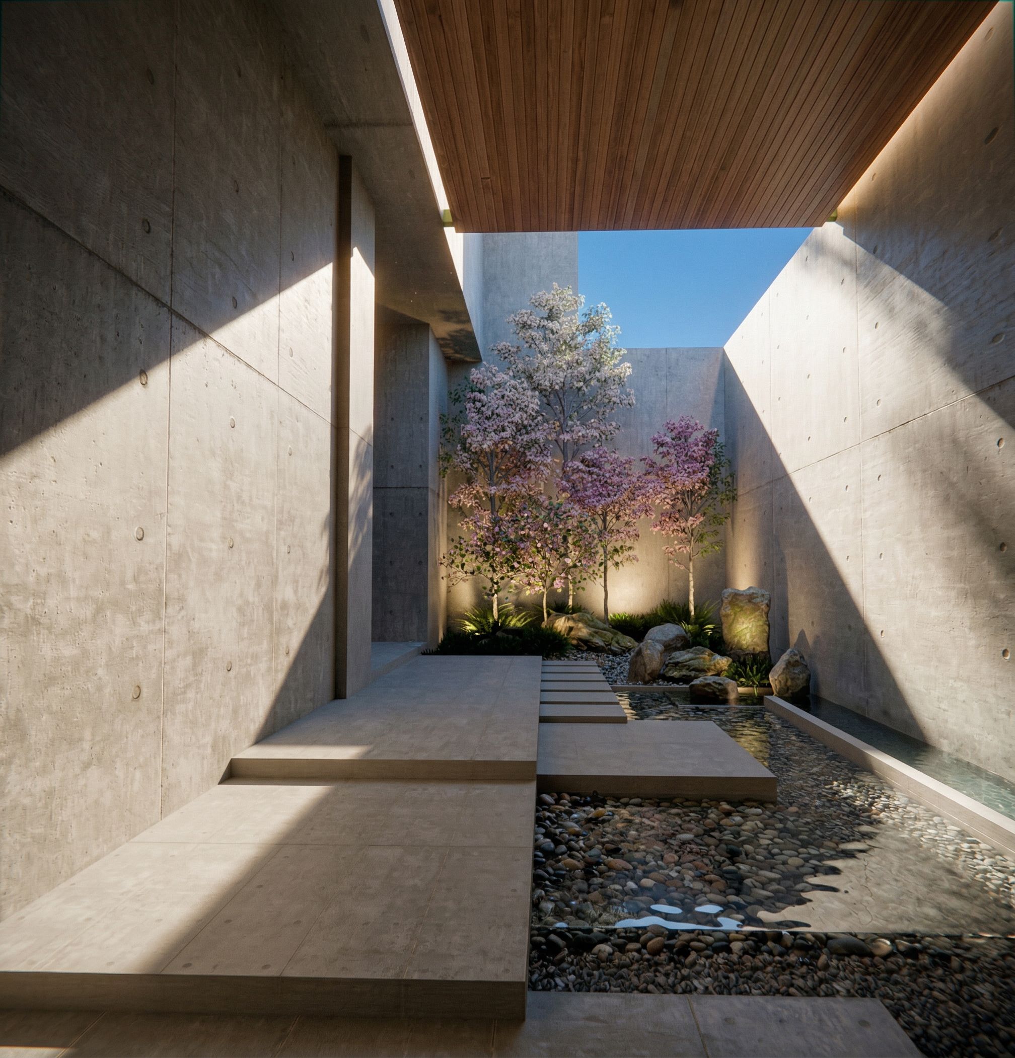 Mejora la iluminación para que se vea con claridad el jardín zen del fondo. Mejora la textura de las pequeñas piedras de rio del suelo.