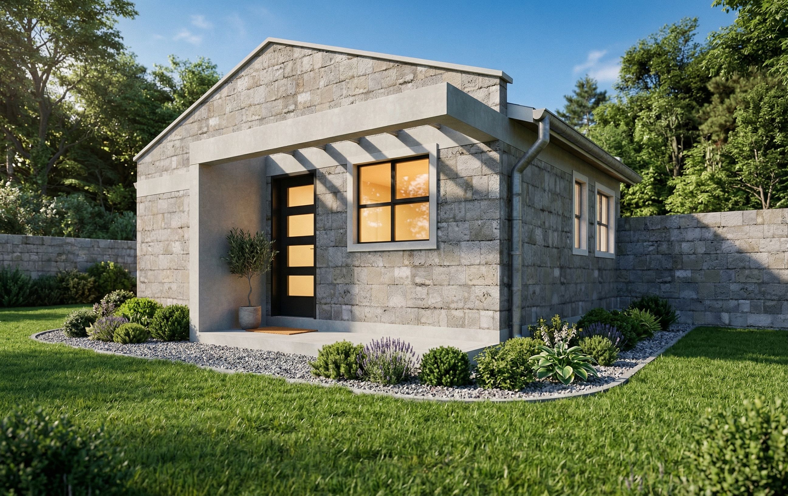 PromptA small single-story house is constructed with grey stone block walls and textured grey concrete trim detailing around the base, roofline, and porch. A dark front door with glass panels and a large square window with black frames are visible on the front facade, while two smaller vertical windows line the side wall. The building is surrounded by an expansive lawn of lush green grass and a perimeter wall made of matching grey stone blocks. Bright sunlight illuminates the scene under a clear blue sky, casting soft shadows across the verdant foliage and mature trees in the background.Turn on warm lights in the house making it look lived-in. Add gravel and shrubs around the footprint. keep exact camera angle., keep exact camera angle