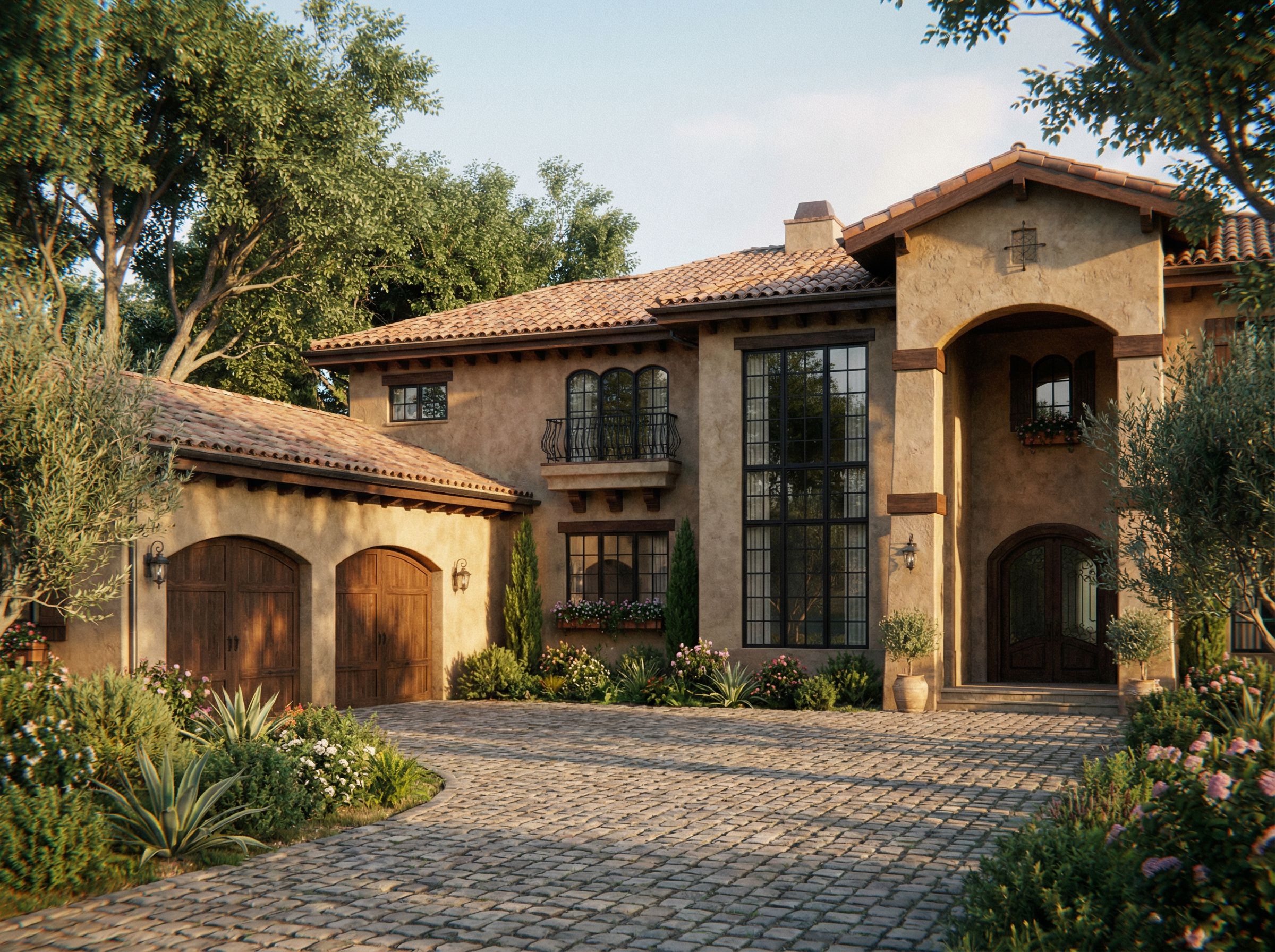 PromptRender this Mediterranean villa with large black framed windows. Dark stained wood accents. Terracotta tile roofing. Large two car courtyard garage on left side with two arched garage doors. Pulled forward. Textured stucco finish throughout. Wrought iron railing. Established neighborhood setting in early morning with smooth shadows and lots of lush greenery.