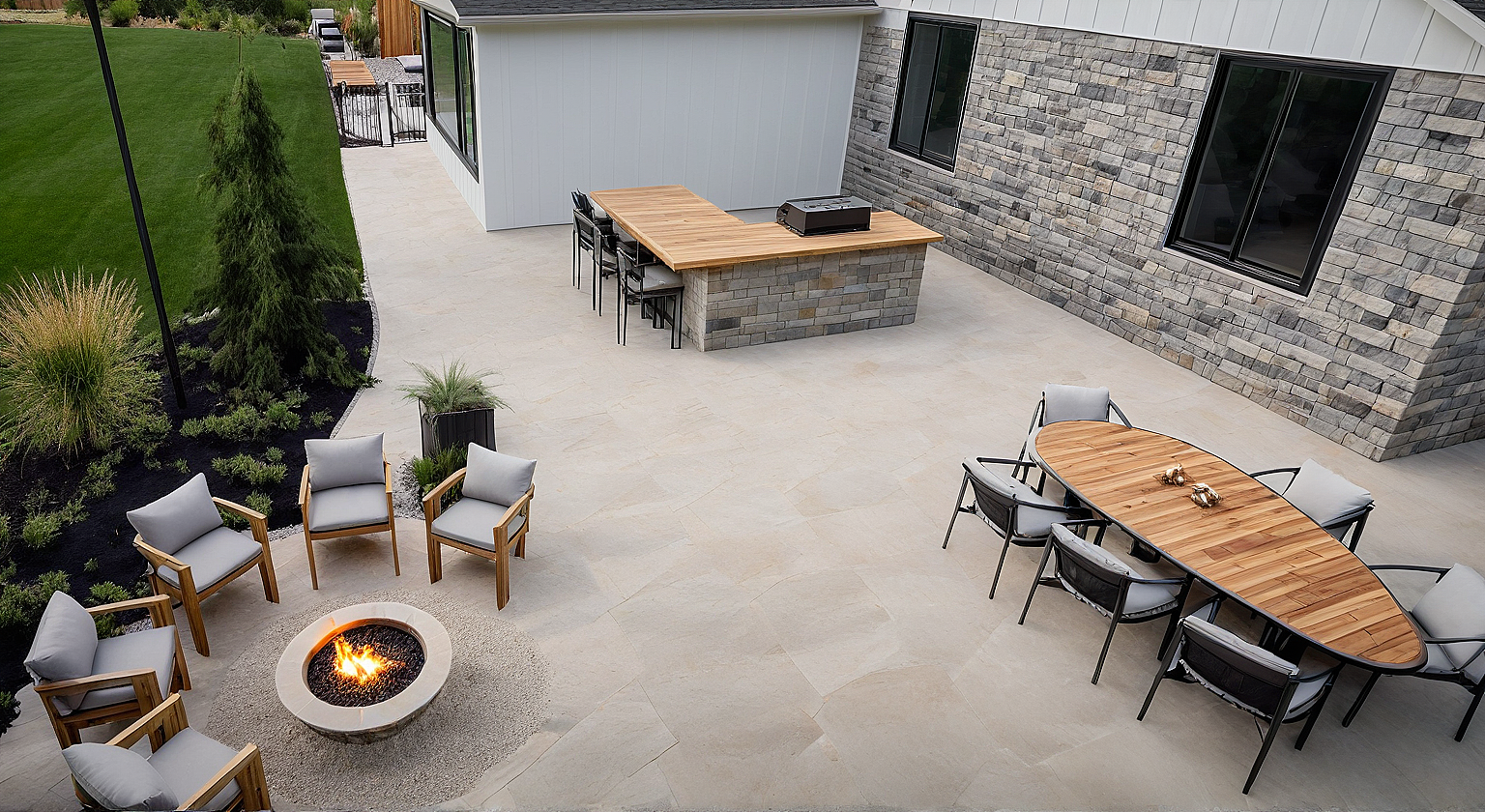 turf lawn, limestone retaining wall, perennial grasses, juniper trees, Russian sage, flagstone. concrete patio, white board and batten siding, black mulch, teak outdoor kitchen, fire pit, white cushions