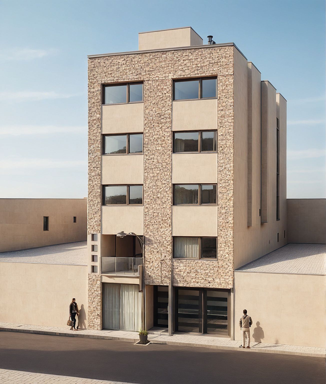 Building, modern facade, daylight, beige walls with stone.