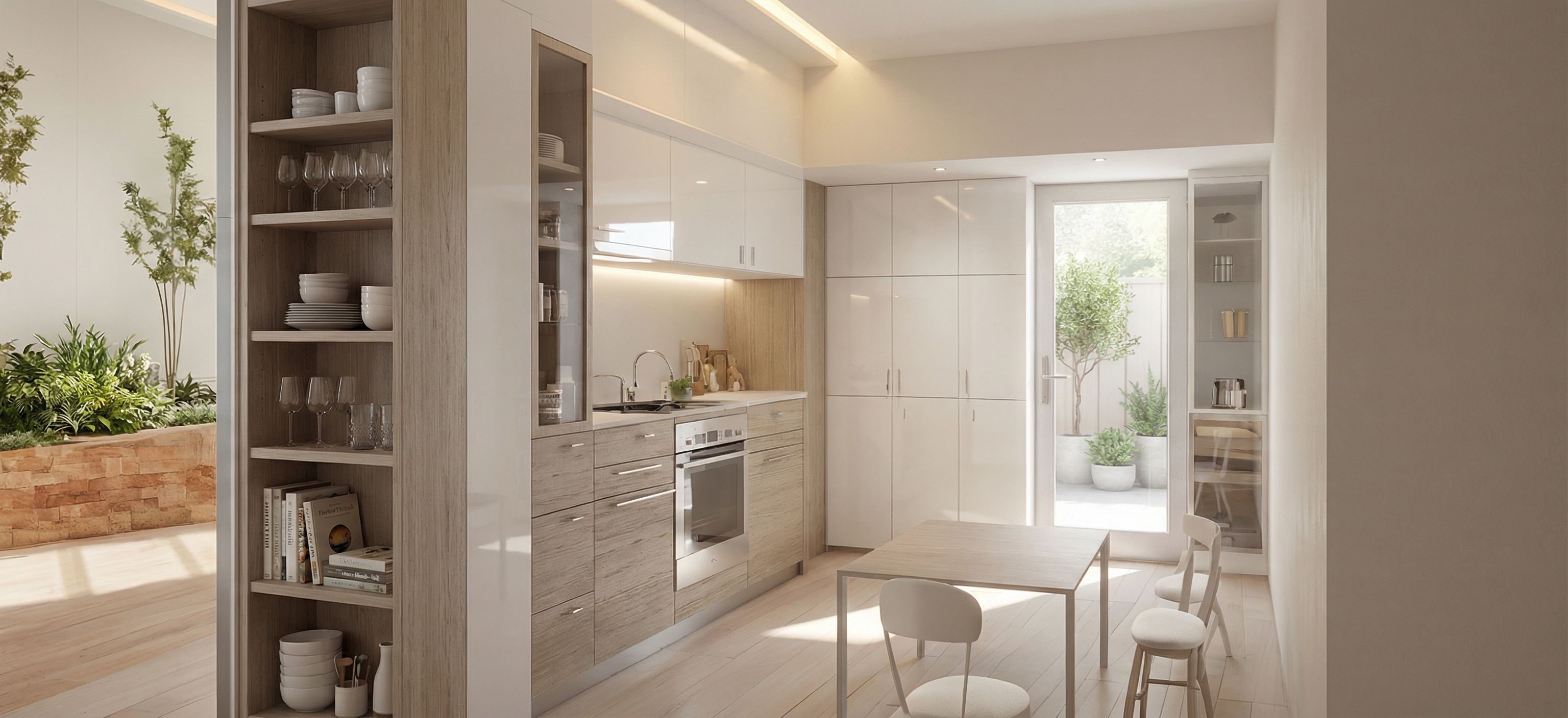 interior design rendering, render this photo into photorealistic rendering, Photo of a modern kitchen, featuring sleek cabinetry with a minimalist design and integrated lighting. Highlight the smooth textures of white finishes and wood elements, with a balance of natural and artificial light streaming through large glass doors. The outdoor greenery visible adds a fresh touch to the urban context. Capture the scene from a corner angle to emphasize depth, using a standard lens for a realistic portrayal of spatial relationships and warmth, ensuring an inviting atmosphere., keep exact camera angle, bright daylight, natural lighting, including furniture, ambient lighting, high quality, professional, detailed scene