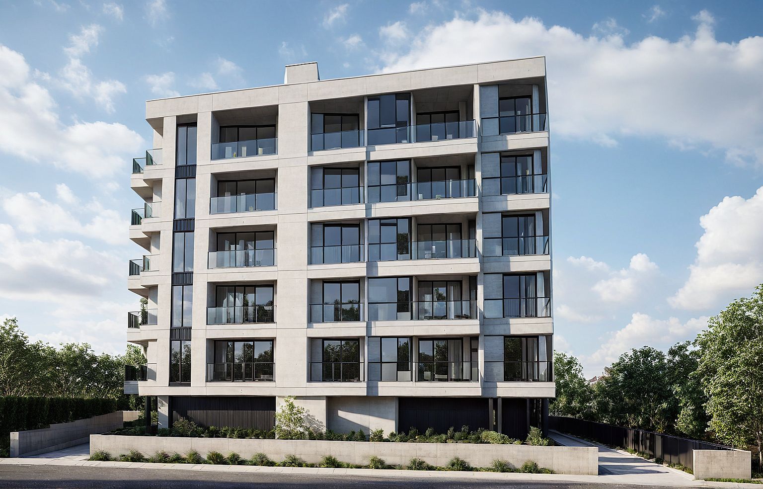 PromptGenerate a realistic rendering of a contemporary mid-rise residential apartment building in a clean, urban cityscape during daylight. The facade should have a minimalist, geometric design with light grey or off-white concrete or plaster cladding. Include full-height glass windows with black aluminum frames and cantilevered balconies with sleek glass railings. The building should feature sharp edges and deep recesses for shadows and depth. Place it within a landscaped urban setting, with low boundary walls, trimmed shrubs, scattered trees, and a paved foreground. In the background, include a soft city skyline with low-rise buildings and a clear blue sky with scattered clouds