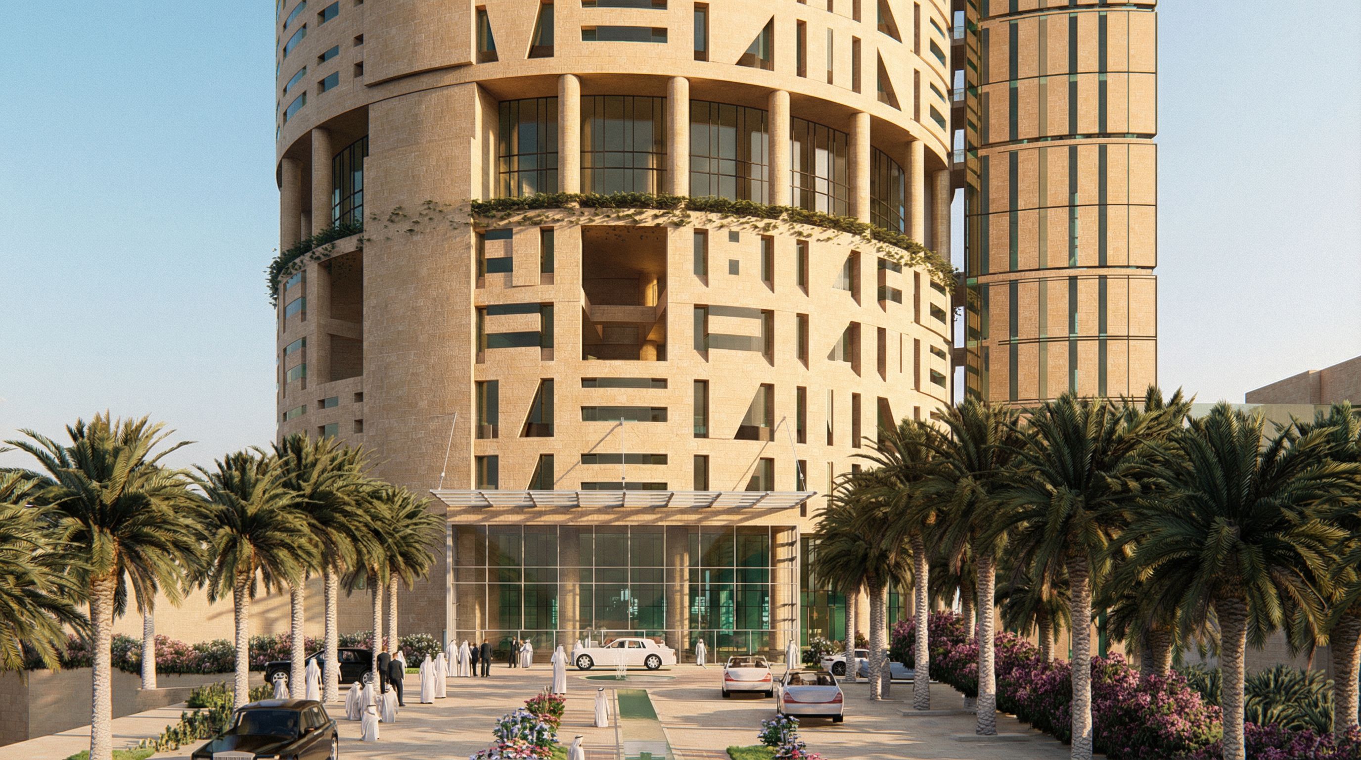 Same building facade, same materials, no material or color changes. Facade refinement only through openings. Introduce horizontal linear openings combined with small triangular openings inside it inspired by Salmani architecture. Triangles are integrated into the facade cuts, forming elongated triangular voids. Strong interior–exterior connection expressed through controlled openings. Play of light and shadow created by triangular and linear cuts. Clean, minimal, contemporary Saudi architecture following King Salman Charter principles. No added elements, no patterns, no ornamentation., keep exact camera angle
