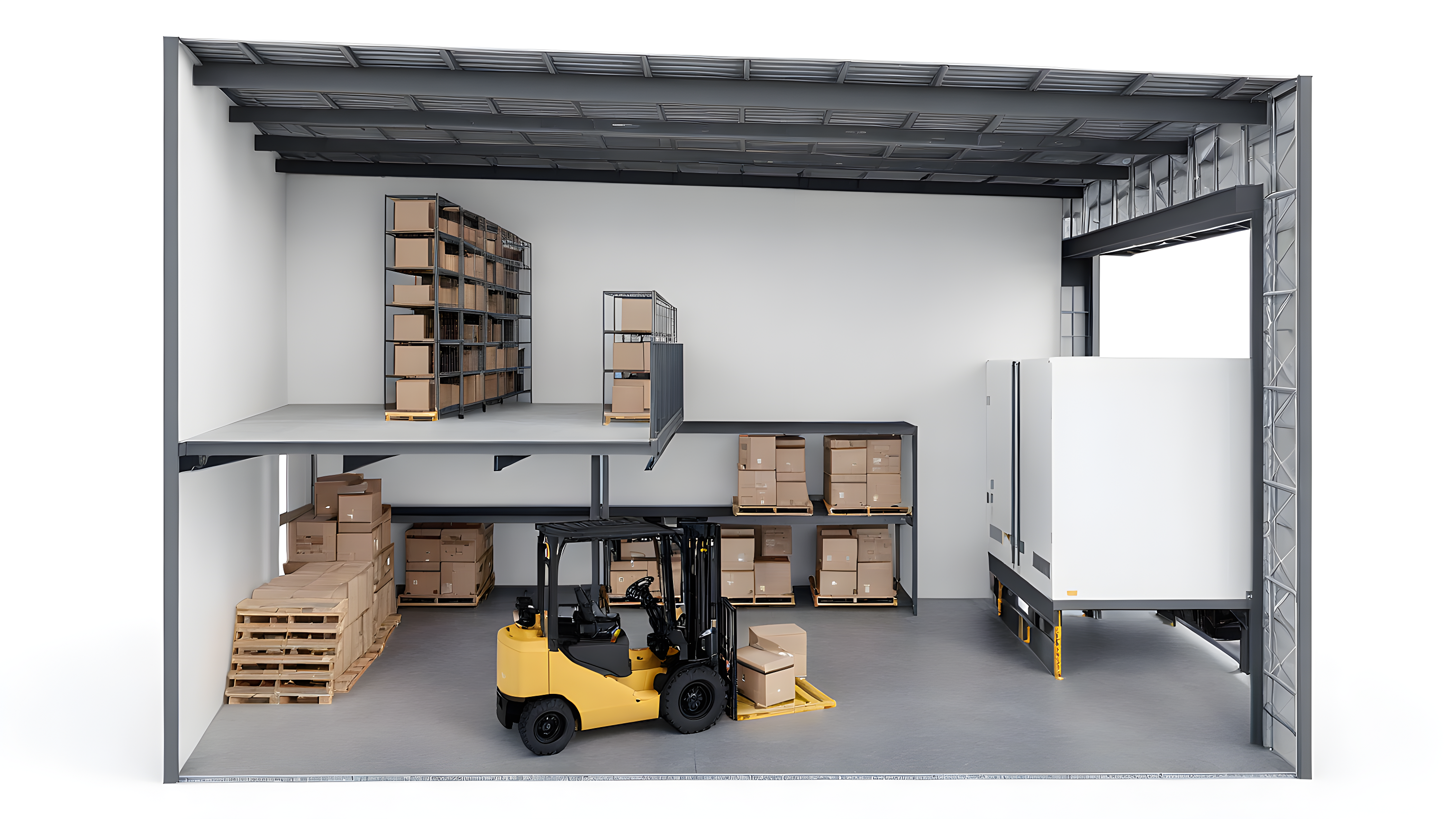 Promptsectional view of a modern, simplistic, and light filled storage warehouse. white space is to be white space. there is a mezzanine level above the ground floor