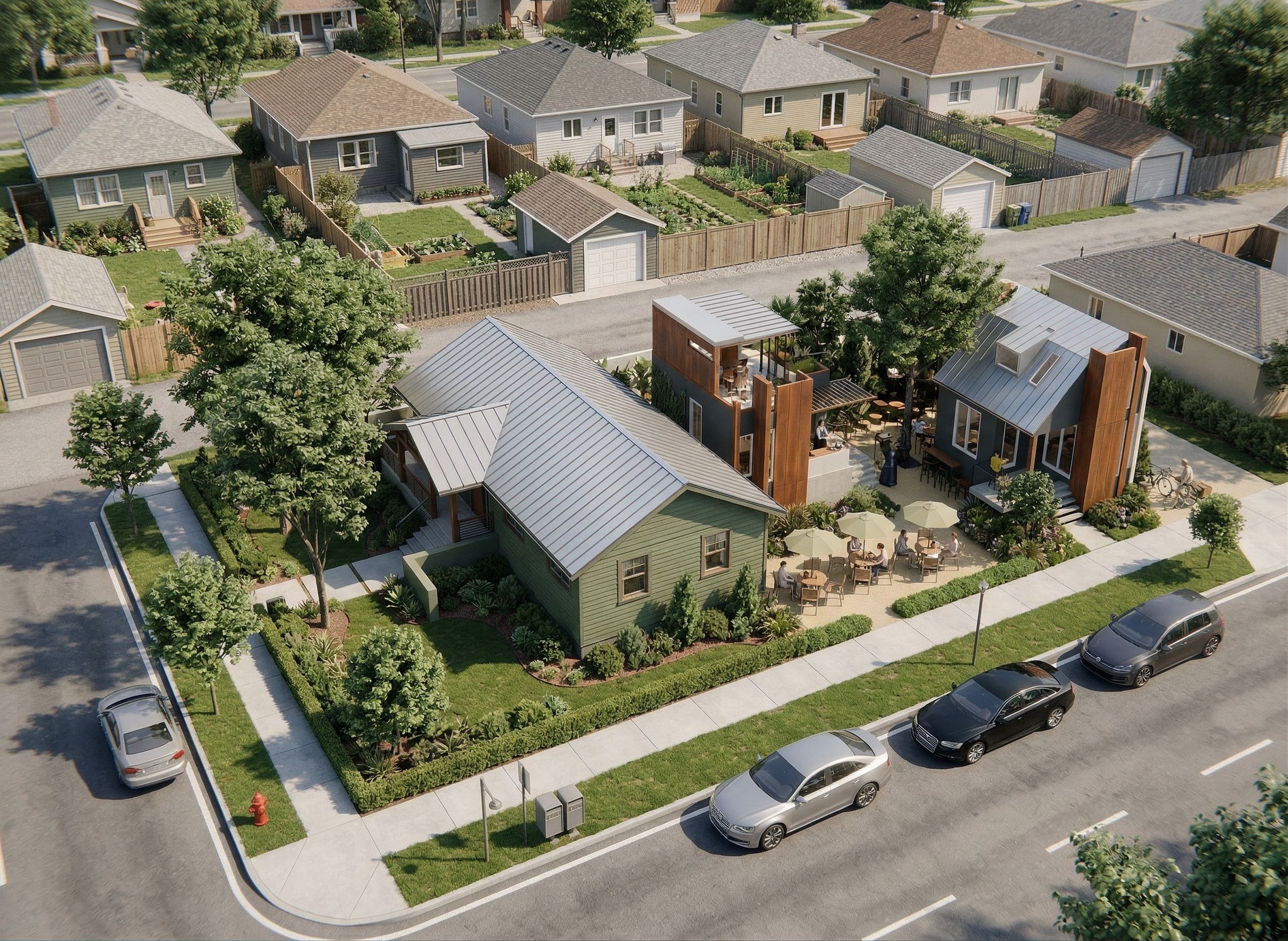 use same angle of all previous images turn background perpendicular to previous image and put lane in back and parallel to street in front of house remove dimensions remove rusted steel fences remove stone walls keep landscaping show back yards of bungalows beyond