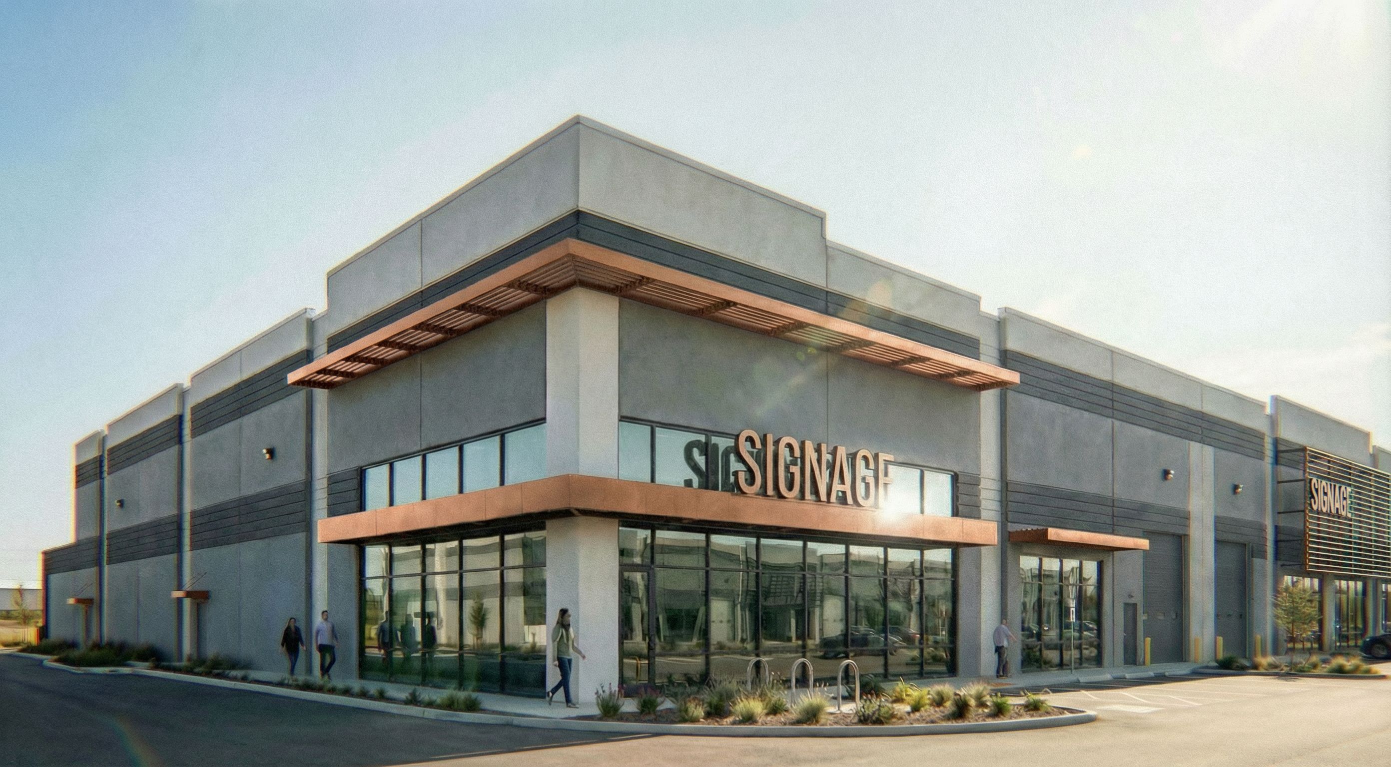 do not change anything in this image except for the color of the awnings and louvers. the awnings and louvers should change colors from being medium bronze to being a copper penny color. they should be metallic with some reflectance, but not too shiny. only change the color of bronze metals, do not change any of the walls or paints, keep exact camera angle
