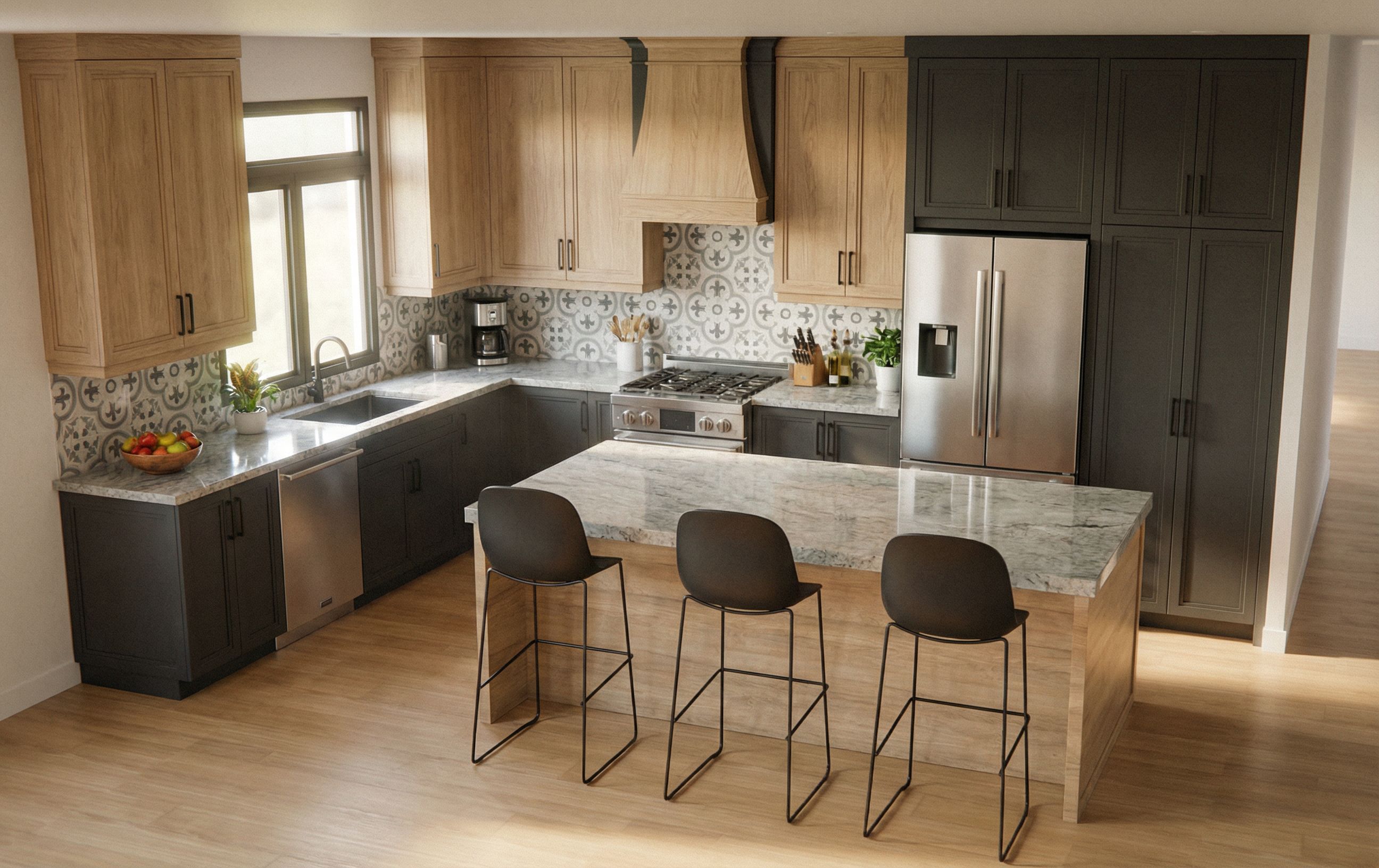 Photo of a modern kitchen featuring sleek cabinetry and a spacious island. Emphasize the contrast between the dark lower cabinets and light wooden upper cabinets, highlighting the smooth granite countertop. Showcase the stylish backsplash with intricate patterns. The setting is bright, illuminated by natural light coming through a window, creating soft shadows across the room. Capture a slightly elevated perspective that highlights the layout and functional design, using a standard lens for a balanced focus on the space's elegance and vibrancy., keep exact camera angle