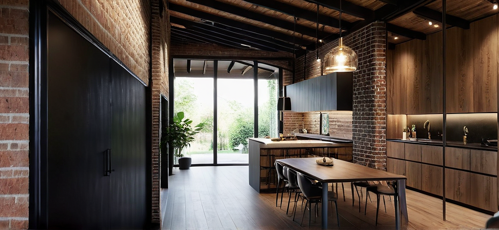 wood celing. black beams, middle wall bricks kitchen, dinner table, glass, modern, simple, sophisticated, windows exterior vegetation