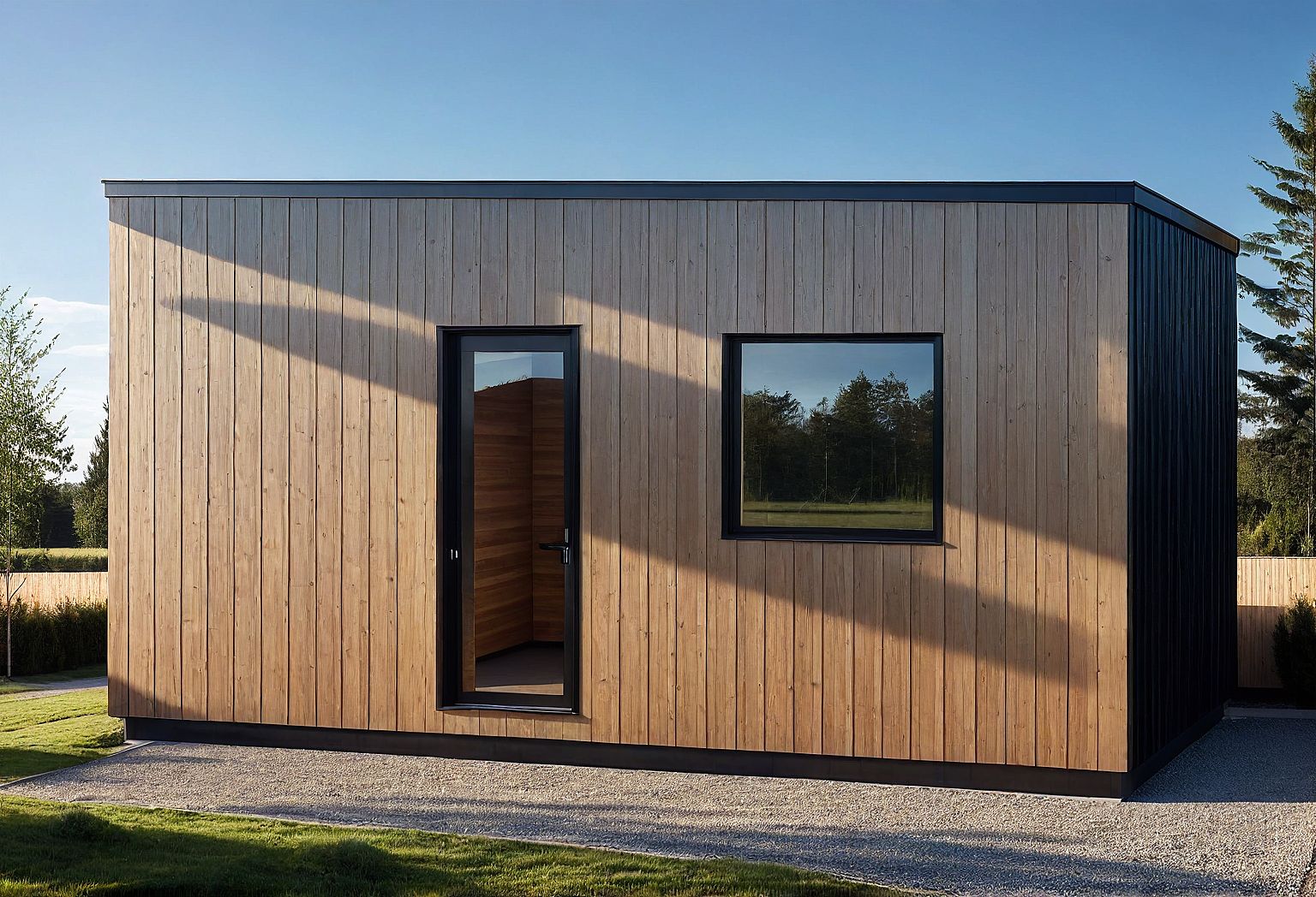 PromptPhoto of a modern shed, featuring vertical wood paneling with a sleek black roof. The entrance showcases a glass door and a large adjacent window, emphasizing transparency and light. Set in a tranquil rural environment with minimalistic surroundings. Natural daylight illuminates the facade, casting gentle shadows that highlight textures. Captured from a low angle for a dramatic perspective, focusing on the building's sleek lines and inviting entrance.