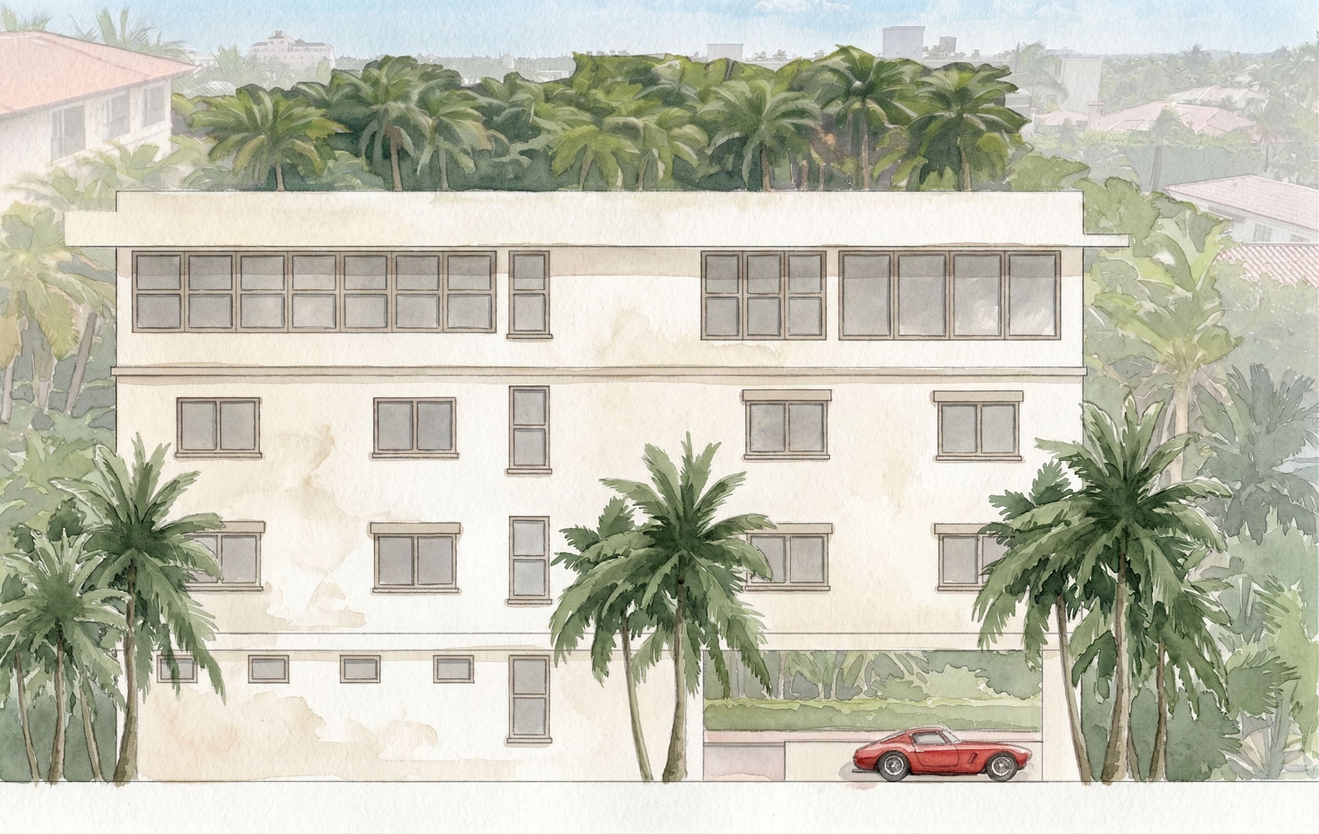 DO NOT change the architecture in any way. Do not alter proportions, windows, railings, or layout. Do not add or remove elements. Do not crop the image. Keep the view front-on with only a very subtle sense of depth, while maintaining the clarity of an architectural elevation. PROJECTION CONTROL VERY IMPORTANT: Maintain a primarily front-on elevation view Allow only minimal and controlled depth no strong perspective All horizontal lines must remain level and consistent All vertical lines must remain straight no distortion or leaning The building must read as an elevation first, not a perspective rendering The roof must remain visually flat and not tilted Do not exaggerate or expose top surfaces of the roof or slabs Mechanical equipment may have slight depth but must remain subtle STYLE: The entire image must read as a hand-painted watercolor, not a filtered or photoreal image Simulate real watercolor behavior on textured paper Use visible pigment variation, including: • uneven color washes • soft pooling of pigment • subtle blotching and tonal variation Edges should vary naturally: • some soft and diffused • some slightly defined where brush pressure would occur Avoid smooth digital gradients — all color transitions should feel organic and painterly Introduce subtle paper texture throughout the image Allow slight inconsistencies in tone to mimic real hand-painted work Reduce photoreal detail and replace with simplified, painterly interpretation IMPORTANT: Do not apply a watercolor “filter” effect Reinterpret the image as if it were painted by hand using watercolor techniques BUILDING PRIMARY FOCUS — KEEP SHARP: Main stucco: warm creamy white HEX #EFE7DA Subtle tonal variation only highlights #F6F1E8, shadows #E4DBCC Window frames and railings: muted taupe HEX #C8C1B6, matte finish Glass: soft gray tone HEX #B8B6B0, minimal reflection Maintain crisp edges and clear architectural definition SHADING: Soft, even, non-directional shading No dramatic lighting or strong shadows Only subtle depth at: • window recesses • underside of slabs • balcony edges BACKGROUND + LANDSCAPE REFERENCE-BASED, LUSH BUT CONTROLLED: Use the provided background as the base composition Enhance it to feel lush, layered, and characteristic of Palm Beach Do not fully replace the background — refine and unify it Palm trees should be full and dimensional but softened: • slightly reduce contrast and saturation • blend edges gently to match watercolor texture • maintain readable frond structure without sharp realism Introduce layered greenery foreground, midground, background for depth Smooth transitions between layers to avoid harsh separation Adjust greens to feel rich but controlled: • base green HEX #A8B79A • mid-tone HEX #8FA77F • deeper accents HEX #6F8F63 used sparingly Background buildings should be simplified, lightly visible, and desaturated Reduce photorealism and unify everything into a watercolor style Slightly reduce background contrast and detail 20–30% so it does not compete with the building SKY: Soft watercolor blue sky HEX #D6E6F2 Gentle tonal variation with subtle cloud texture Keep it light, calm, and slightly desaturated GROUND: Maintain a clean, straight horizontal ground line where the building meets the ground Use a light watercolor wash to suggest the ground plane Keep the building visually grounded and stable CARS: Simple, elegant watercolor-style vehicles Neutral tones white, beige, soft gray Minimal detail with soft edges, no harsh reflections COLOR + CONTRAST: Slightly increase warmth and color richness 10–15% Avoid washed-out appearance Maintain soft watercolor quality with no high saturation Ensure the building reads clearly against the background MOOD: Romantic, airy, and refined Warm Palm Beach atmosphere Calm, elegant, and presentation-ready IMPORTANT: The building must remain the sharpest and most defined element Background, trees, and cars should remain softer and more painterly The final image should feel cohesive, balanced, and suitable for client presentation, keep exact camera angle