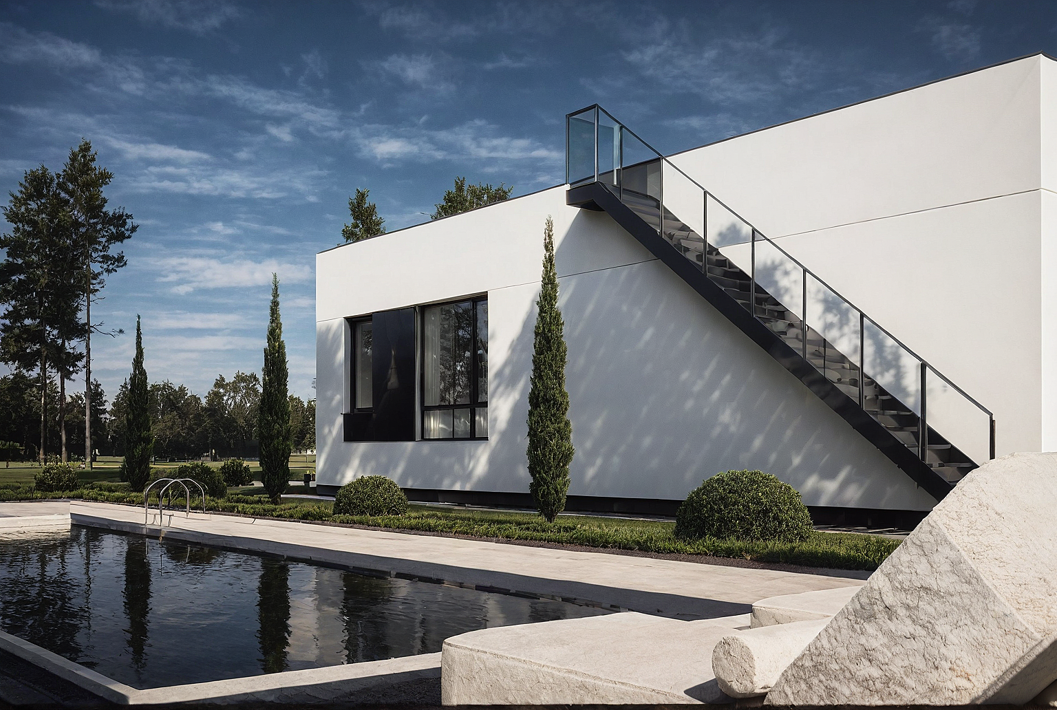 Promptvery realistic photo, sunny day, like it, beautiful surroundings, white house with dark panels