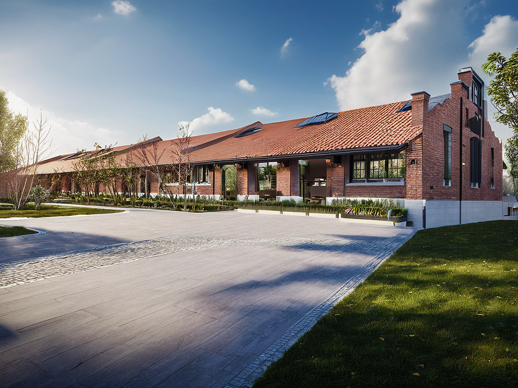 Promptsame facade style, same materials of the construction, terrace, tables and chairs, garden, bikes
