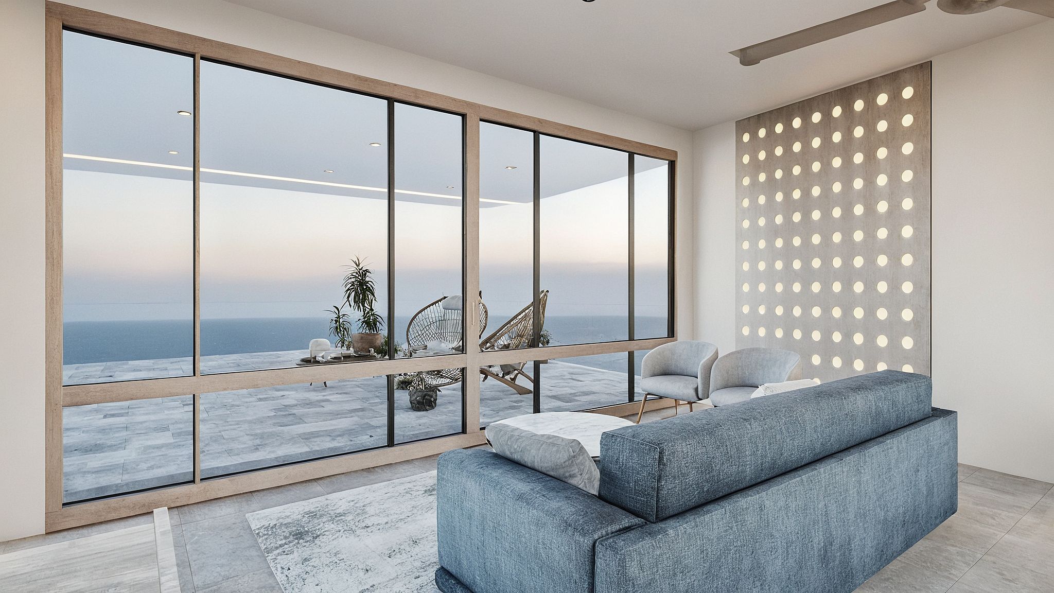 PromptPhoto of a modern interior living space featuring a cozy lounge area. Emphasize the sleek design elements, such as a textured blue sofa with mixed cushions, a minimalist round marble coffee table, and light gray chairs. Highlight the large black-framed glass windows that open to an outdoor patio with woven seating and greenery. Beyond the balcony terrace, an ocean view stretches across the horizon. Natural lighting floods the room, casting soft shadows across the surfaces. Capture the perspective from a low angle to enhance the spacious feel, ensuring both the outdoor elements and ocean are included in the frame. Aim for a warm, inviting atmosphere reflecting contemporary comfort.