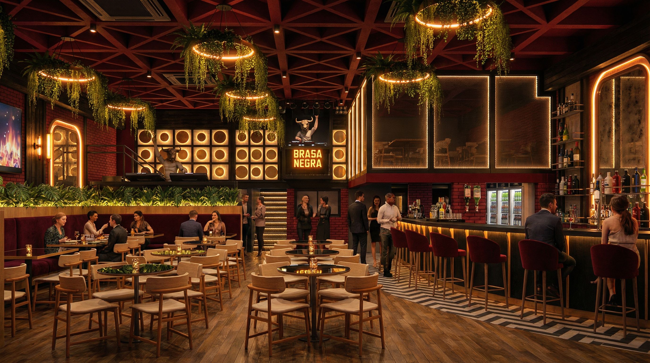 Ultra-photorealistic interior render of a luxury modern cantina restaurant named Brasa Negra, nighttime scene. Elegant, vibrant and festive bar atmosphere inspired by glowing embers, fire grilling and upscale nightlife. Dark, sophisticated environment with warm amber and copper lighting creating depth, contrast and dynamic reflections. Ceramic wood-look floor tiles, 18×60 cm planks, natural texture, realistic reflections. Luxury booth seating upholstered in aged velvet fabric, deep wine color, with light natural wood backrests. Artificial greenery above booths for organic contrast. Exposed concrete waffle slab ceiling painted in wine color, dramatic shadows, strong texture definition. Feature wall in wine-colored painted brick adding depth and warmth. TV wall framed with Shou Sugi Ban charred wood panels, rich blackened texture. Vintage wall sconces on both sides of TV wall, warm low-intensity ambient light. Two architectural arches made of 2-inch metal tubing painted copper, side-lit with integrated amber LED strip lighting. Aged mirror panels behind arches reflecting warm light, silhouettes and movement. Suspended circular ceiling elements with artificial plants and integrated warm LED lighting, creating a floating garden effect. Staircase side clad with black perforated metal sheet, softly backlit for subtle glow. Replace bull sculpture reference with a bull–human hybrid DJ sculpture, steel and metal material, bull head with human body, DJ playing music. Keep same scale, position, orientation and presence as original bull reference image. Dining tables with mirrored tops, realistic reflections. Wooden chairs matching booth backrest tone. Cinematic lighting, high contrast, global illumination, soft shadows, realistic reflections, depth of field. Luxury nightlife hospitality interior, ultra-detailed materials, premium textures, professional architectural visualization, 8K quality. Keep exact original camera angle and framing., keep exact camera angle