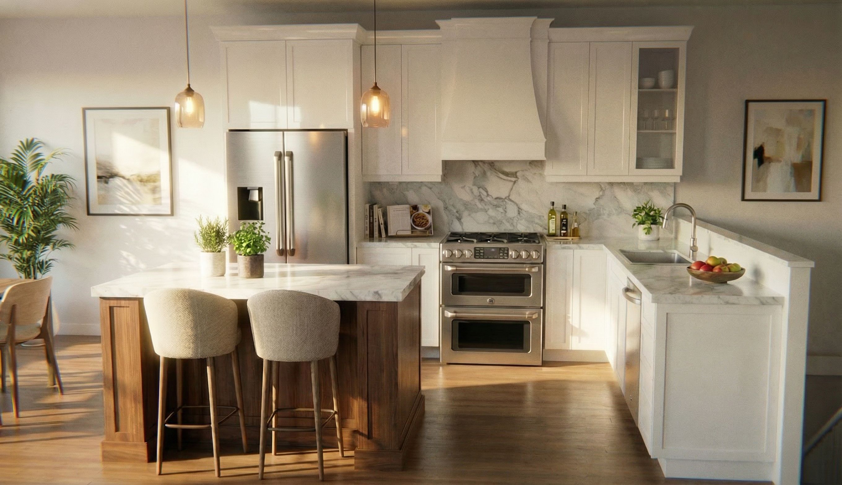 PromptAll white kitchen, wood island full sun no shadows, keep exact camera angle
