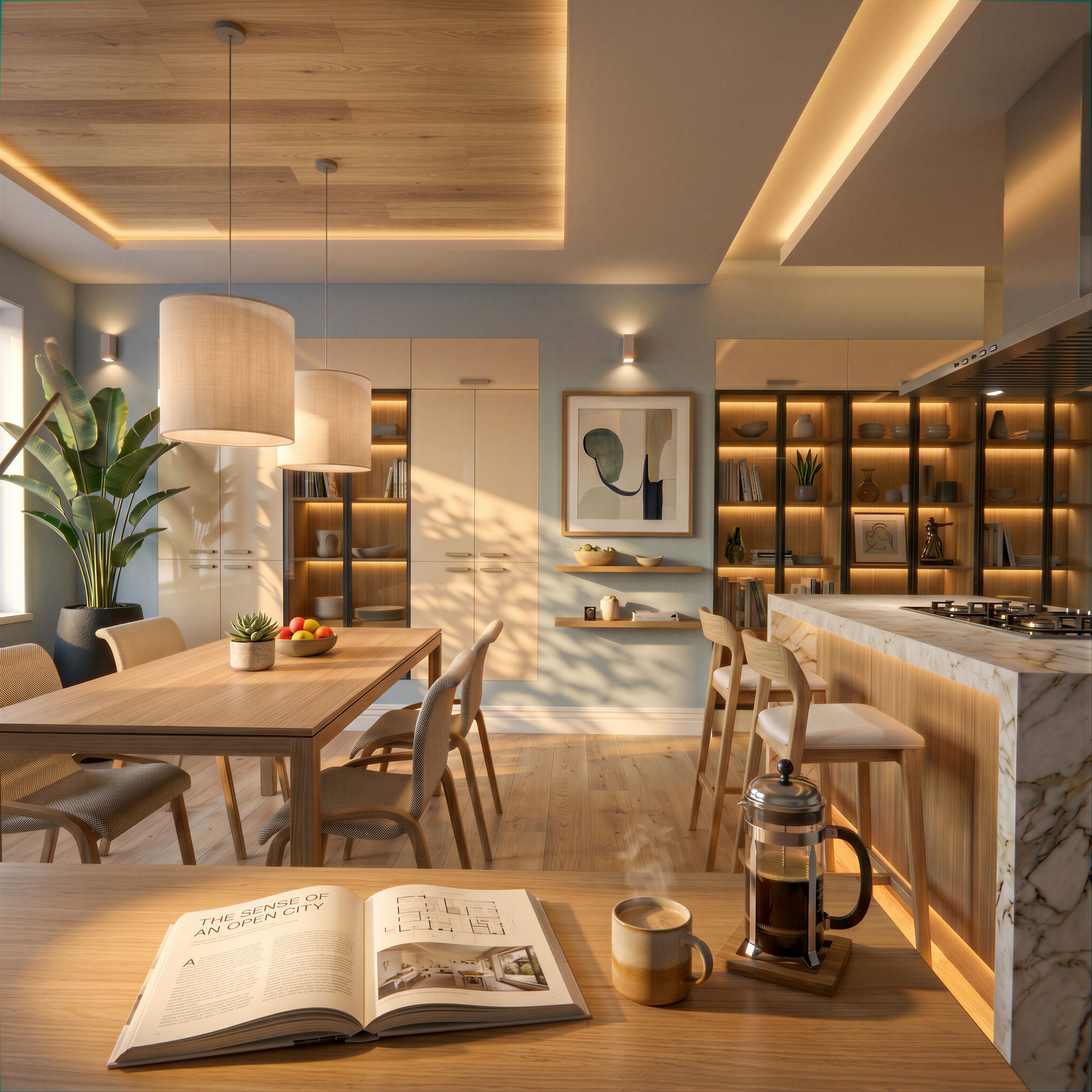 EnhancedPromptElimina las plantas colgantes que están en las estanterías. Añade sobras a la luz que entra por la ventana como si hubiera un árbol por fuera que deja pasar la luz y genera un sutil contraste de luces y sobras. Elimina la luz lineal que está debajo de la barra de la isla de la cocina y respeta la luz que está en el zócalo de la isla. Añade el material de la imagen de referencia 1 en el foso central del falso techo que está sobre las lámparas de techo y ponlo en la misma dirección que el suelo de la sala. Añade una luz lateral cálida como de un flexo colocado a la izquierda y que ilumine el libro que está en primera toma de la imagen., keep exact camera angle