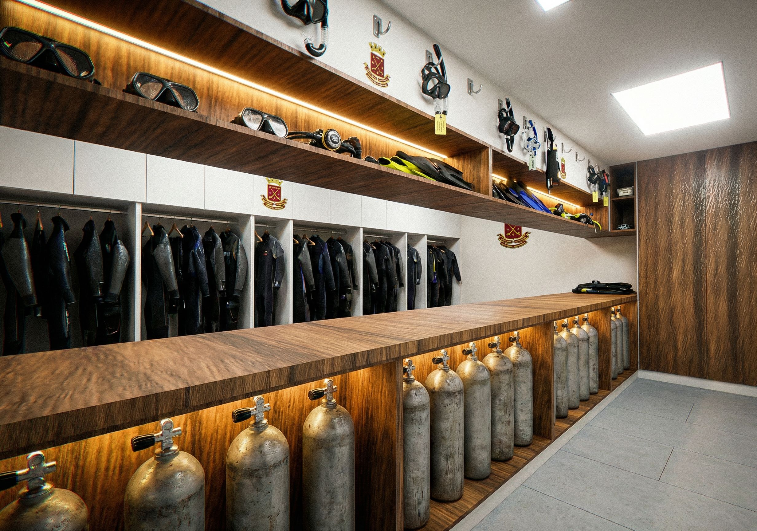 Promptporfavor quita todas las puertas en el mueble derecho, vas a colocar en la parte baja puras bombonas de oxigeno y estara con iluminacion indirecta del tope, en el mueble de fondo coloca trajes de buceos guindados, y en el aereo deja solo una estanteria en todo el largo con luz indirecta y por la parte de arriba de la estanteria en la pared coloca ganchos donde ellos puedan guindar las mascars y esas cosas, es el cuarto de buceo de la guardia nacional bolivariana de venezuela , keep exact camera angle