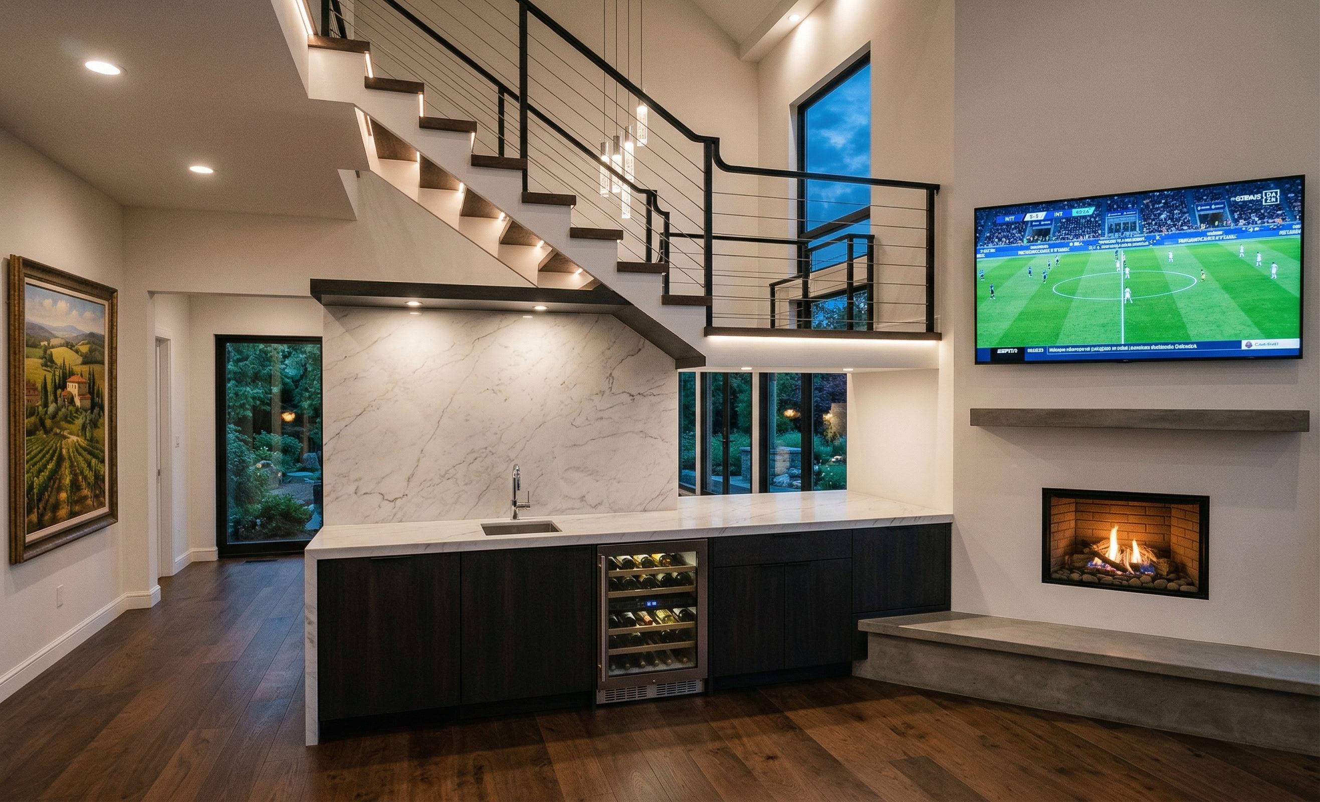 make photorealistic rendering from this image add wet bar under the stairs next to fireplace as indicated by red area design it so the fireplace and wet bar are connected fireplace is direct vent gas fireplace, show fireplace on burning, fireplace wall is drywall TV above the fireplace is playing Italian soccer game change yellow picture frame with Italian countryside scene skies trough the existing stair window do not add more windows do not add furniture green scenery through lower glass door and windows lights on in the room add light fixtures where appropriate, keep exact camera angle