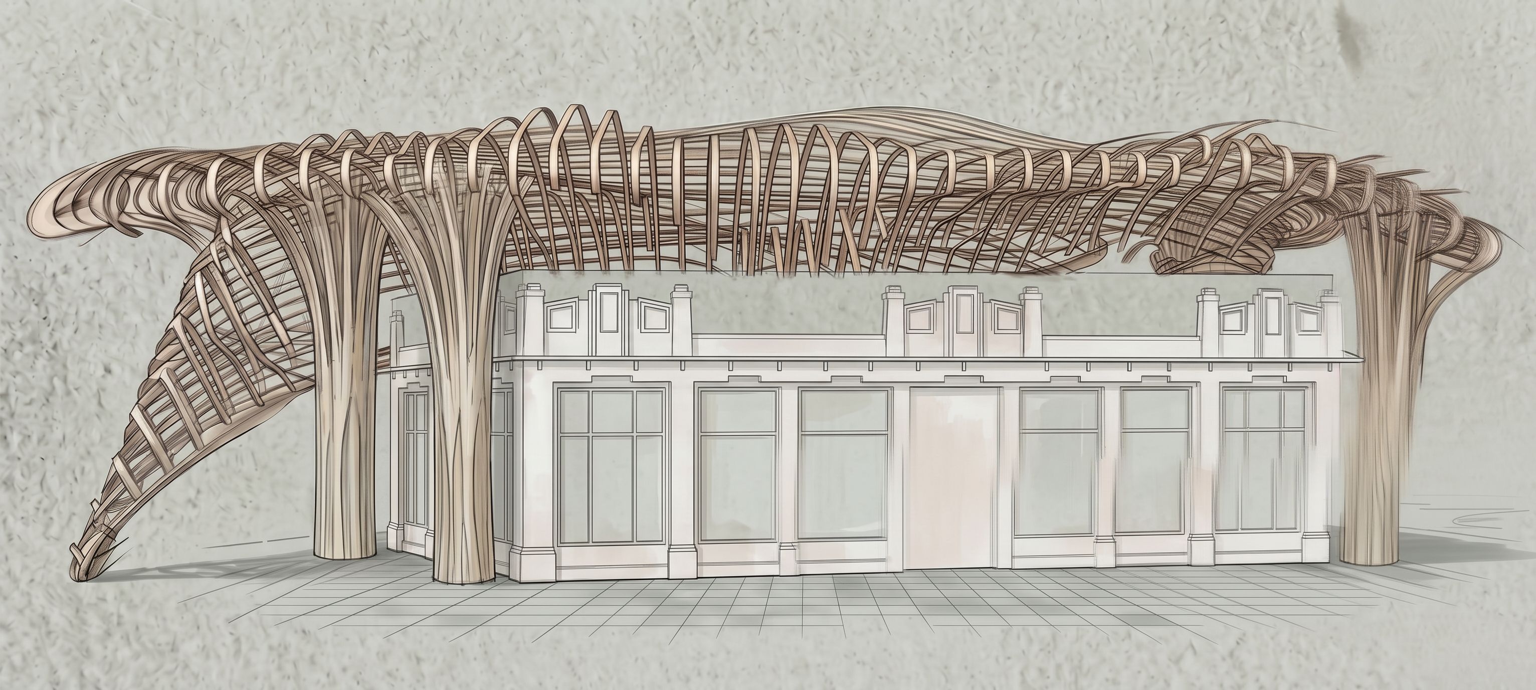 Promptdo this roof like in the reference photo and apply it to this uploaded 3d model and colums and also the building will be same only not with the doors, keep exact camera angle