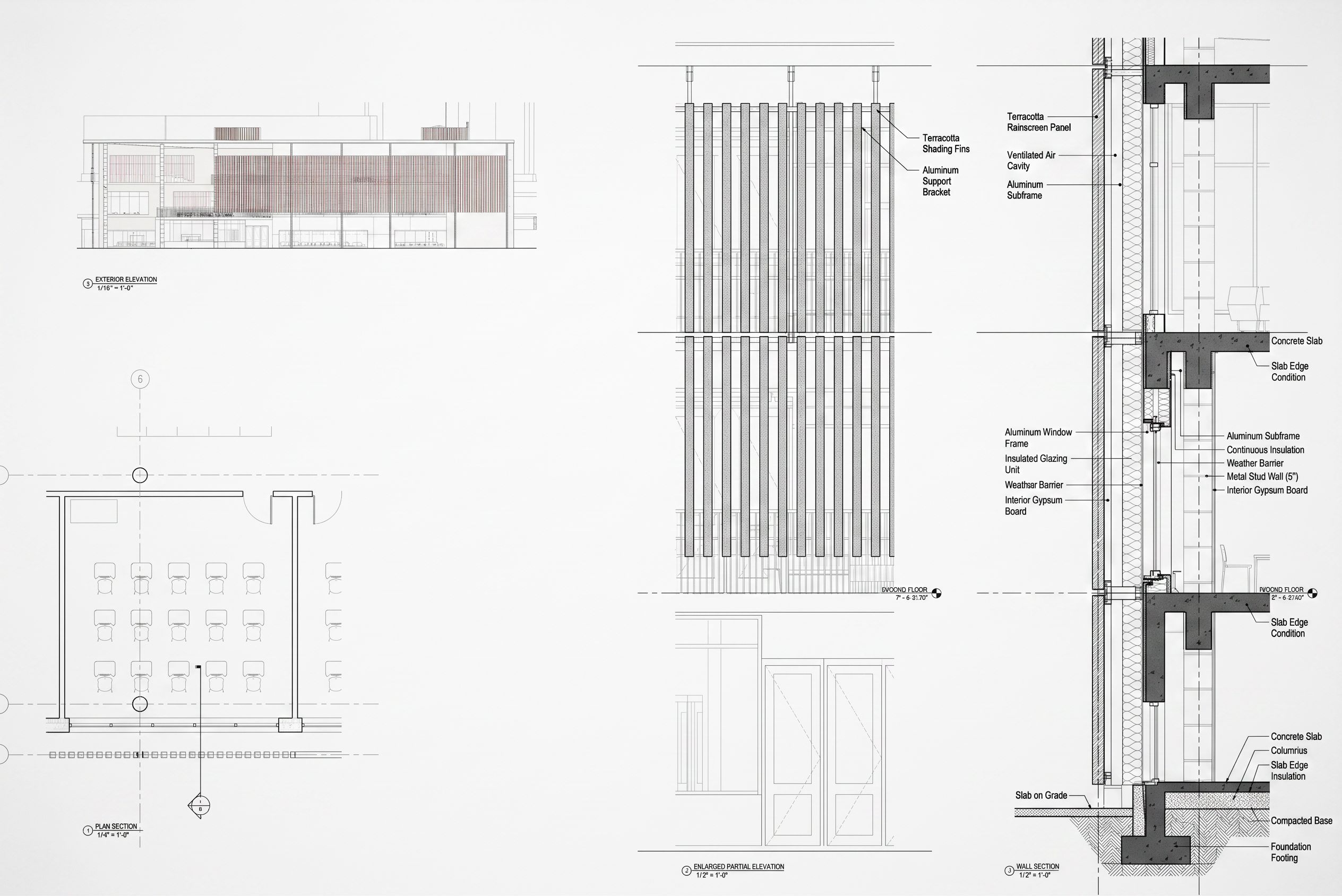 MAKE THE PAPER WHITE Enhance this architectural wall section sheet while keeping the EXACT layout, drawing positions, and composition unchanged. DO NOT move, resize, or redesign any drawings on the sheet. Only refine linework, add material layers, thickness, and detailed annotations. -------------------------------------------------- WALL ASSEMBLY OUTSIDE TO INSIDE — MUST BE CLEARLY DRAWN WITH THICKNESS: - Terracotta rainscreen panel ~1.25" thick, outermost layer - Ventilated air cavity 1.5"–2" gap, left empty - Aluminum rail / subframing system thin vertical supports - Continuous rigid insulation 2"–4", light hatch - Weather-resistive barrier thin line - Metal stud wall 6", with batt insulation hatch - Interior gypsum board 5/8", thin layer Ensure each layer is graphically distinct and readable. -------------------------------------------------- STRUCTURAL INTEGRATION: - Show concrete slab thickness 8"–10" - Show slab edge condition connecting to wall - Add drop panel if near column - Columns if visible should be darker poche -------------------------------------------------- FOUNDATION / GROUND CONDITION: - Show slab on grade condition - Add compacted base below slab - Indicate foundation or footing below - Add insulation at slab edge if visible -------------------------------------------------- WINDOW DETAIL VERY IMPORTANT: - Add recessed aluminum window frame within wall assembly - Show insulated glazing unit double line - Indicate head and sill condition - Show how window sits within insulation layer -------------------------------------------------- SHADING SYSTEM: - Add terracotta vertical shading fins offset from facade ~1'–2" - Include thin steel or aluminum support bracket - Keep aligned with facade system -------------------------------------------------- GRAPHIC STYLE: - Strong poche for cut elements slab, wall, column - Thin lines for background elements - Clean architectural detail drawing black + white - Minimal gray hatching for materials - No color rendering -------------------------------------------------- ANNOTATION CLEAN + PROFESSIONAL: Add labels with leader lines: - Terracotta Rainscreen Panel - Ventilated Air Cavity - Aluminum Subframe - Continuous Insulation - Weather Barrier - Metal Stud Wall 6" - Interior Gypsum Board - Concrete Slab - Slab Edge Condition - Slab on Grade - Aluminum Window Frame - Insulated Glazing Unit - Terracotta Shading Fins -------------------------------------------------- IMPORTANT: - DO NOT simplify the wall - DO NOT leave layers ambiguous - DO NOT over-render - Keep clarity and hierarchy - Make it read like a real construction detail, keep exact camera angle