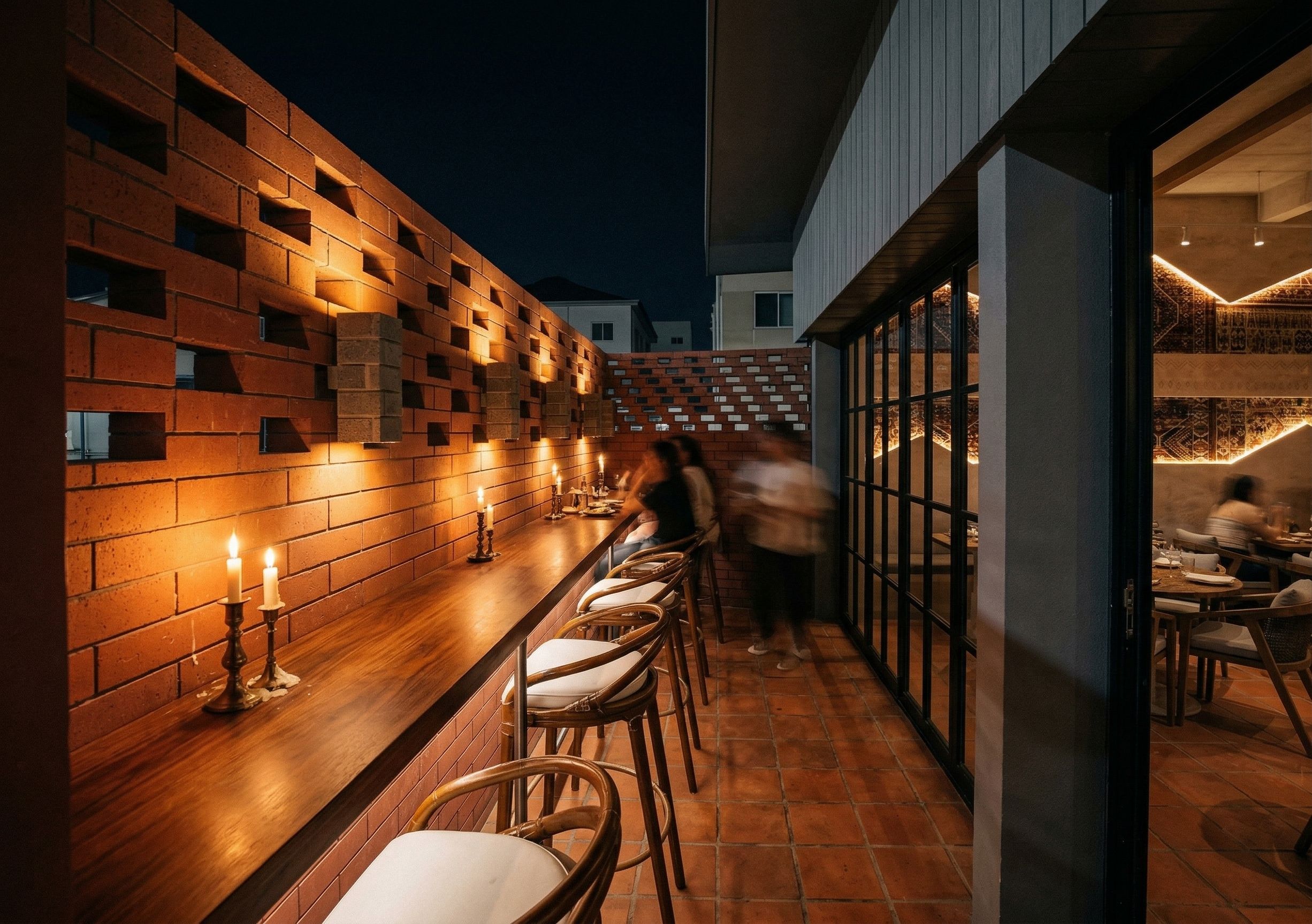This is a frontal terrace of a nice dinning restaurant. İ want a dark ambience and some vintage but simple candles on the bar table the flooring is out of terra cotta inside and outside. The brick walls are a bit reddish bricks and the lapms you see on the brick walls are out of grey brick tiles. The lighting is ember collour. The stormfronts mullions are black and the outter faccade of the building is grey wooden lammeln. in the background there is no high raised buildings. Just 2 storz buildings and directlz next to this building there is one aswell. make the wall inside the building using same style fronm the reference picture i uploaded , keep exact camera angle