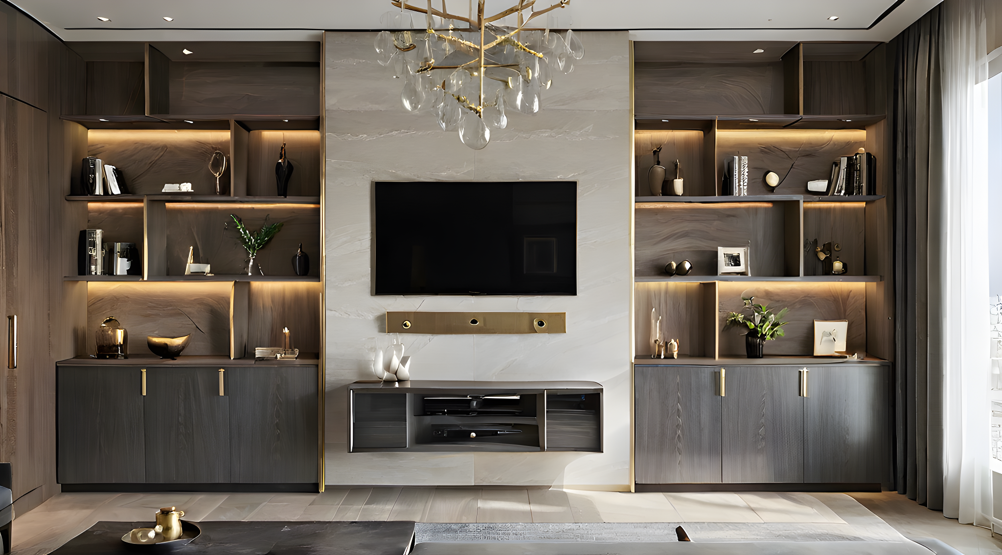 Promptlivingroom with cabinet in gray sycamore veneer and brass details and white walls