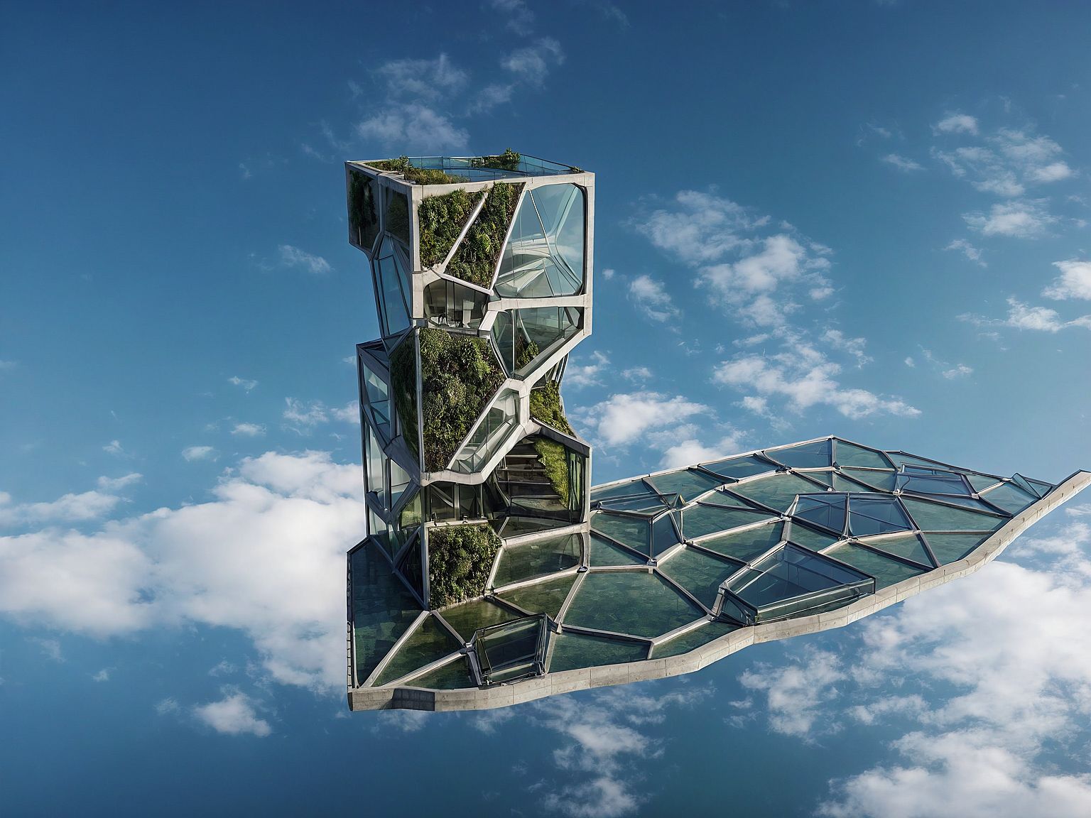 PromptCREATE A REALISTIC SKYSCRAPER CONCRETE IMAGE; ADD GLASS, WINDOW, GREEN ROOF.