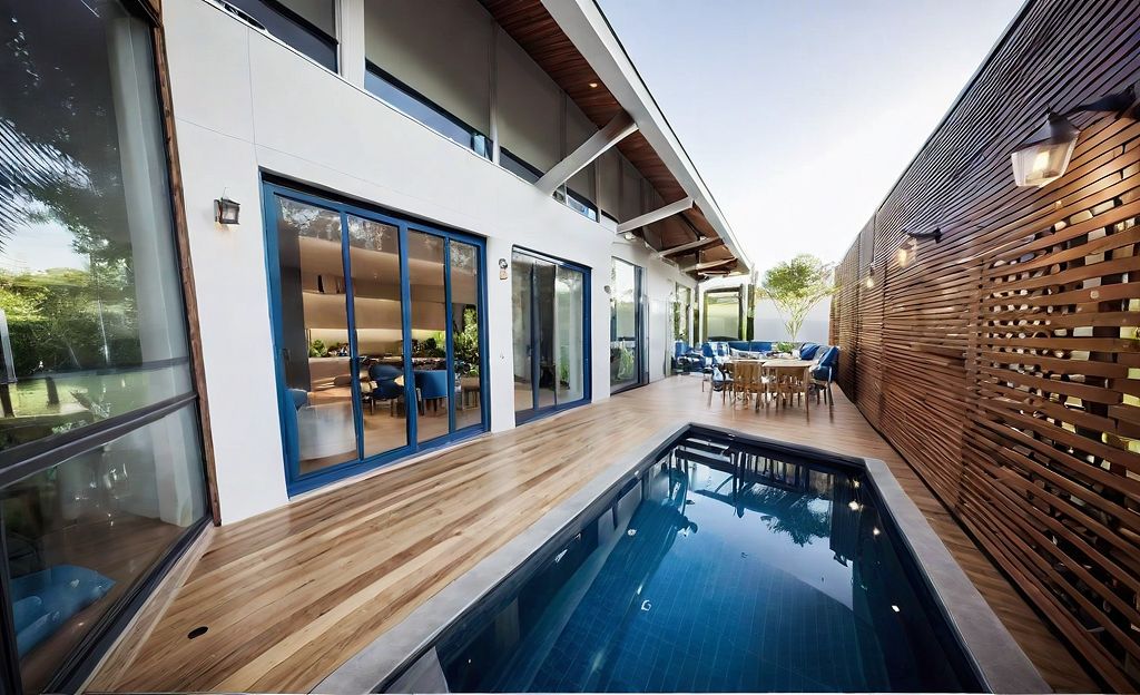 PromptPhoto of a modern residential patio, featuring sleek architectural lines and large glass sliding doors that lead indoors. The materials consist of smooth white walls, wooden decking, and hints of blue furniture. The setting includes a serene swimming pool reflecting light, surrounded by outdoor seating and soft landscape elements. Natural sunlight brightens the scene, creating gentle shadows and highlights. Captured from a low angle to emphasize depth, with a wide-angle lens to enhance the spacious feeling and capture the full atmosphere of relaxation and contemporary design.