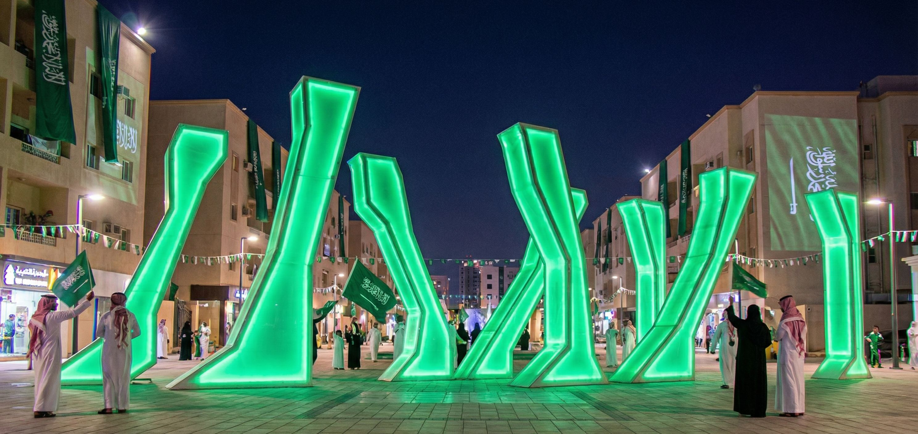 "Green-lit translucent columns in a residential plaza, celebrating Saudi National Day.", keep exact camera angle