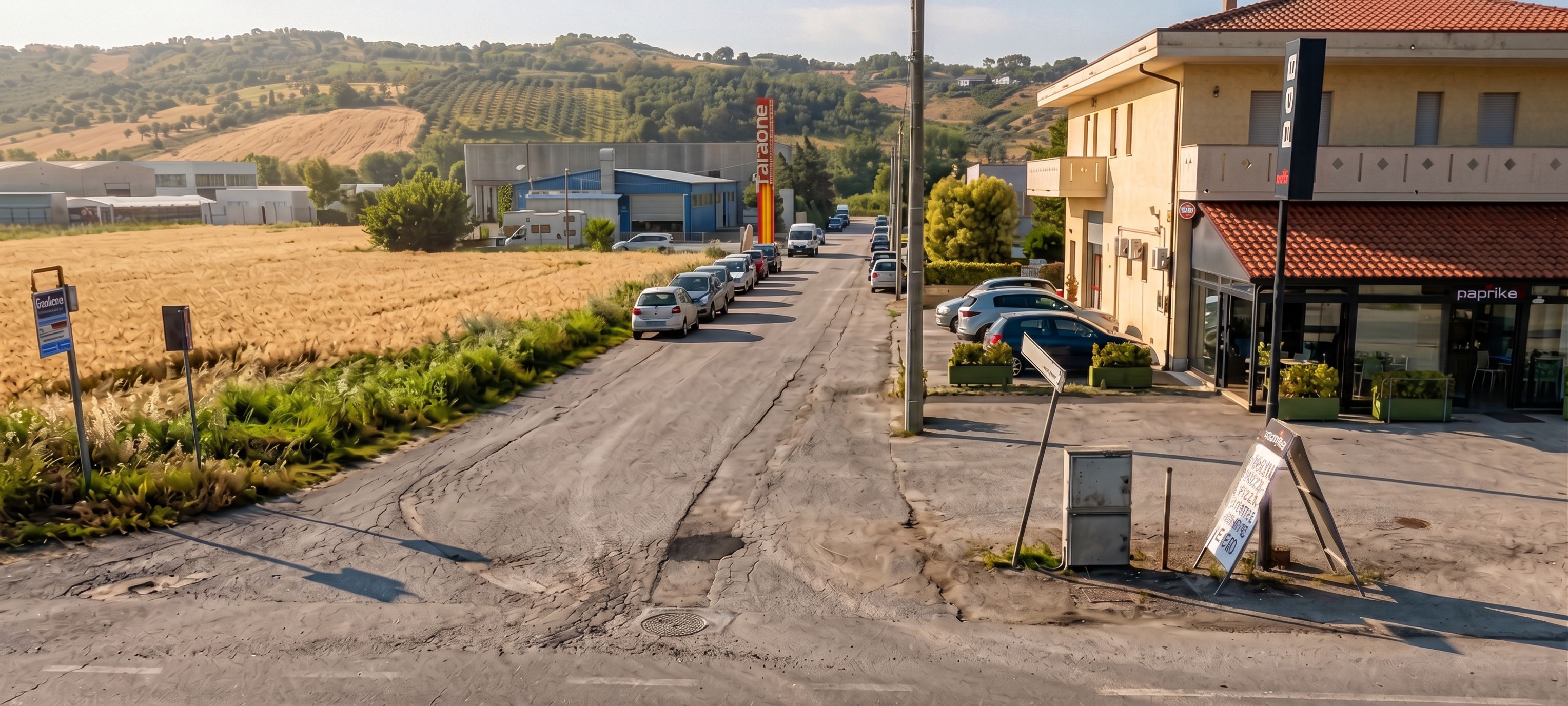 Promptinsert in this image the red totem indicated in the reference image1, at the end of the road that leads up to the concrete warehouse seen in the distance, so that it is visible just above the more distant white van., keep exact camera angle
