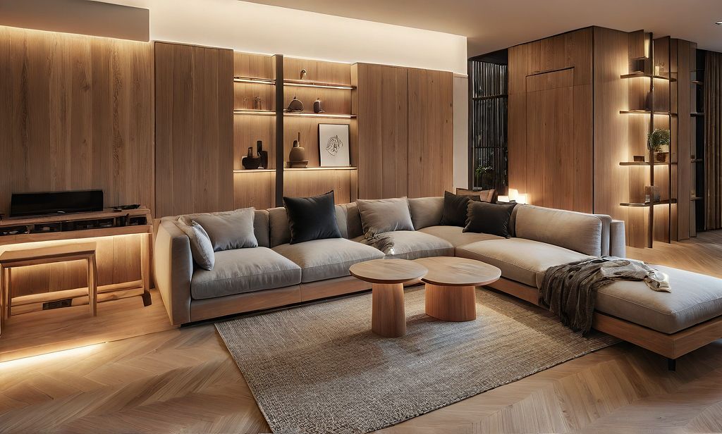 Promptcosy living room in japandi style, with lot of light oak wooden furniture and cosy beige sofa and cosy beige rug with touch of black
