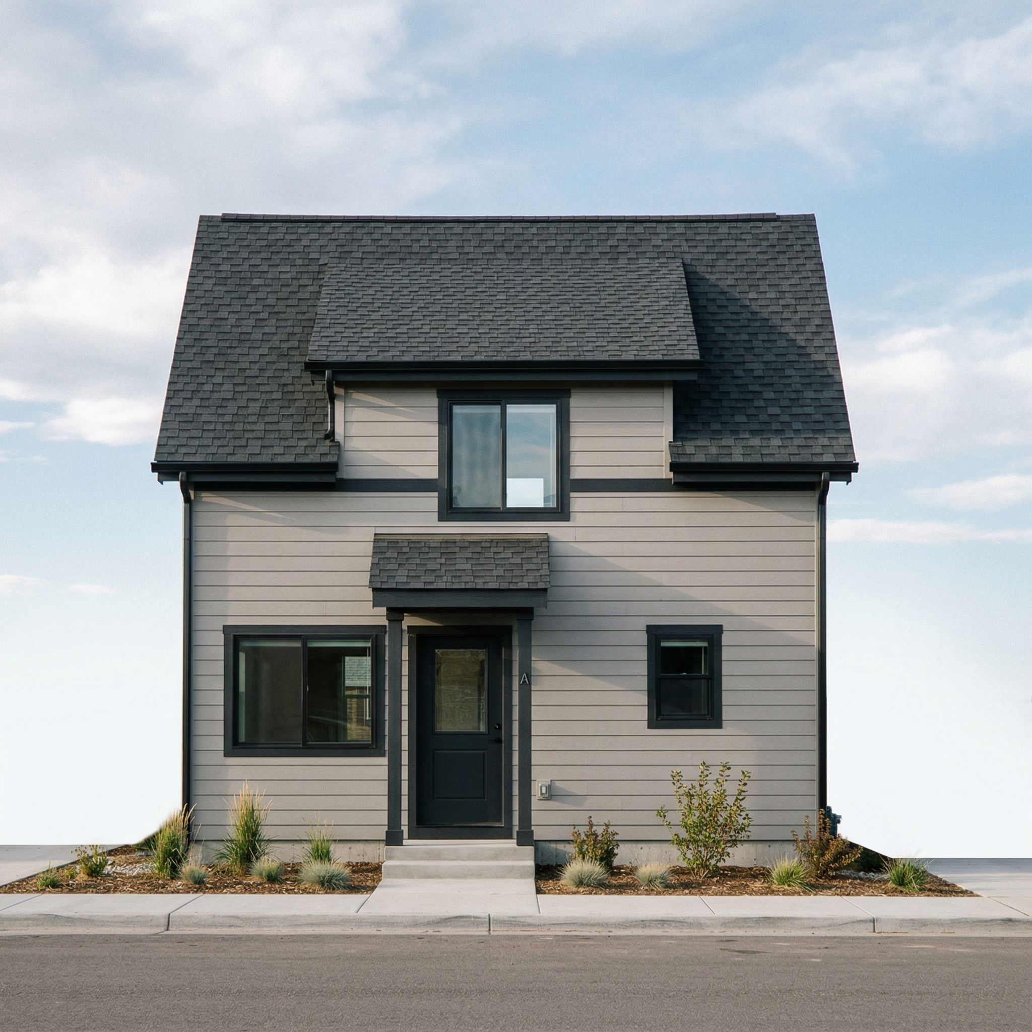 PromptThis will be a 2-dimensional render of an ADU. This ADU will be in Denver Colorado on a flat street. keep the elevation the same as in the image. do not add or change the windows, door, or roof. Place minimal landscaping at the front. The main materials will be a horizonal hardie board, a dark painted wood trim, painted posts at the front porch, and asphalt shingles. this will be a new house so do not show it as worn in. , keep exact camera angle