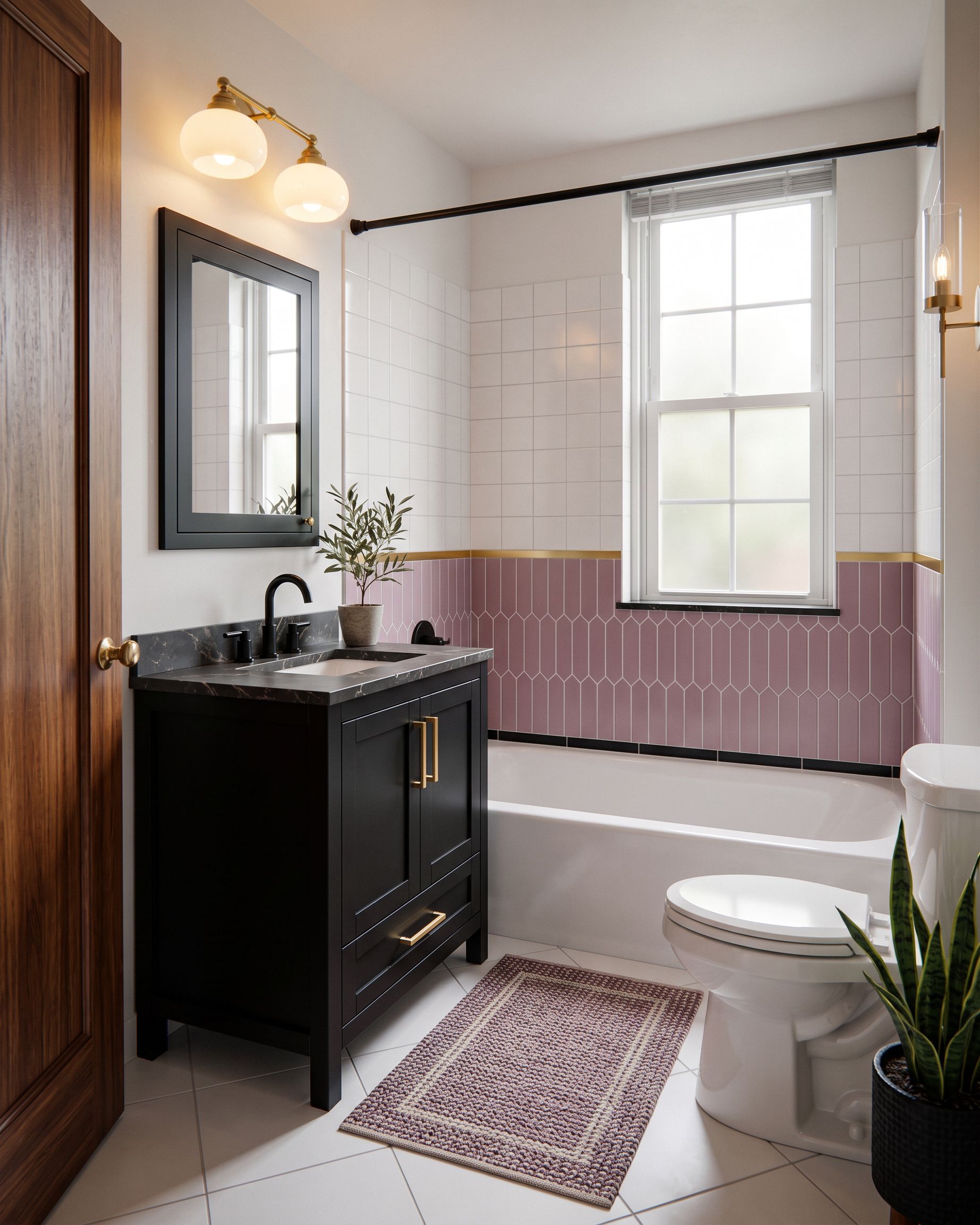 refresh this bathroom with a new black vanity with gold handles and black faucet. Show, a recessed black medicine cabinet and the vanity light shown in reference image. The white tile in the shower should stay - except the horizontal band under the window will be replaced around the entire tub down to the top of the tub. There will be a thin gold metal horizontal band with a mauve tile laid vertically then a black line of tile right at the tub line under that. The floor should be 12"x12" white tile laid on a diagonal. Add a floor mat which has the mauve color in it. change shower rod to black. don't change camera angle, keep exact camera angle
